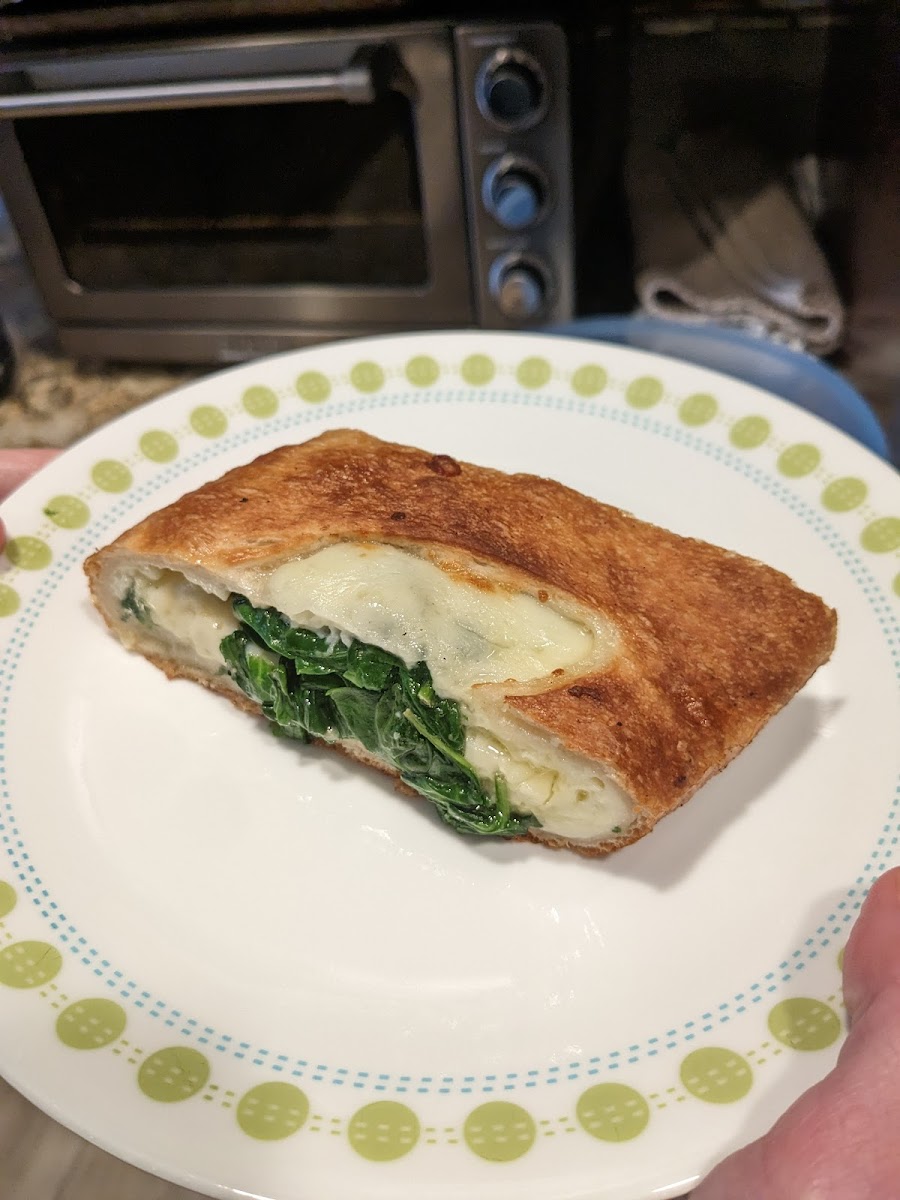 First time here and we ordered the calzone with spinach. I am going to try the gluten free pizza next time we stop in the store. The woman at the counter was very friendly and the place was clean. The only item missing from the Calzone was the ricotta cheese which is usually inside along with the mozzarella. I guess I will have to ask next time since they are so similar to the stromboli.