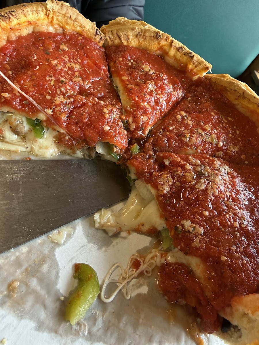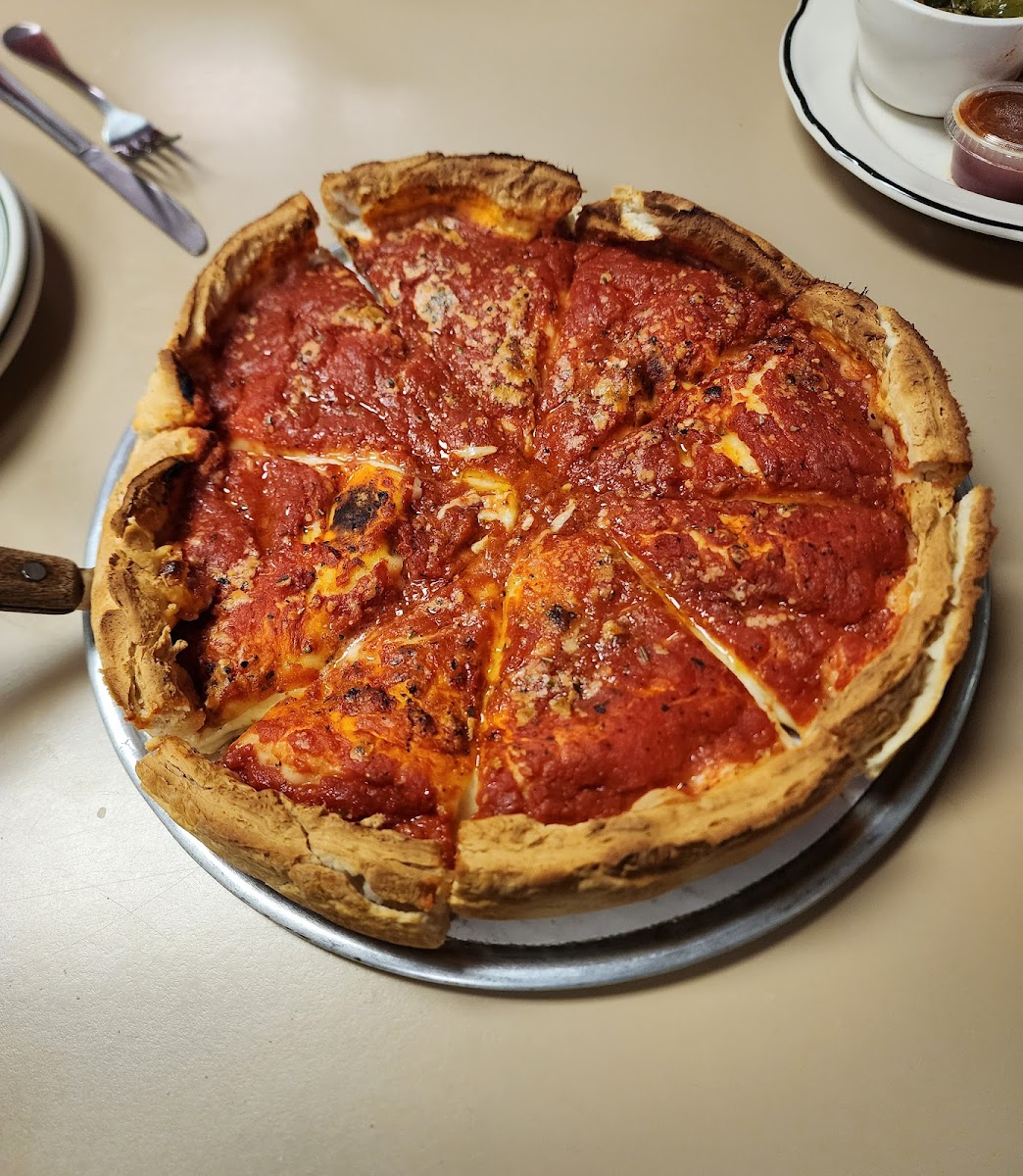 We had a family trip to Chicago and getting some deep dish pizza was on the bucket list. I found this spot online on a list of the best deep dish places to try. It did not disappoint. The deep dish was sooo good and the sauce was delicious. We also had BBQ wings and we loved that the wings were still very crispy. The garlic cheese bread was pretty good aswell. The lady serving was was very nice. Everything was very clean. I invited my family out, we were a group of 8 and unfortunately there were no tables. We had to sit at the booths but it was totally worth it.