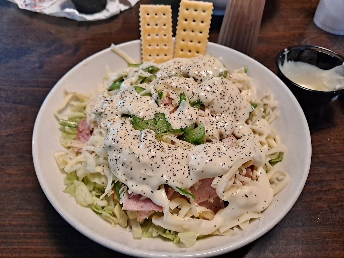 Where the locals eat! Nice hometown pizza parlor. We got the medium pizza special that came with two salads (large) and two large drinks. We got through the salads, but only had room for half the pizza. The pizza had a nice crust underneath. The staff was friendly and attentive. Would eat here again when back in the area.