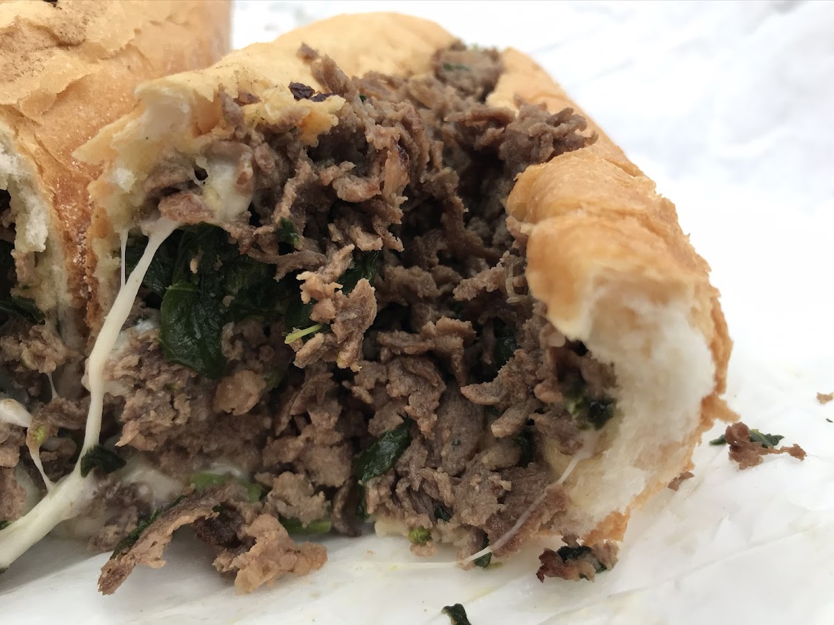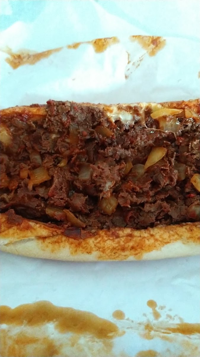 I got a cheese steak with broccoli rabe and sharp provolone cheese. I took it outside for a trunk picnic. It looked good when I unwrapped it. The roll could have been a little fuller. Everything was mixed in and chopped together well. I was hoping for more of a kick from the broccoli rabe. It had a good amount of cheese. I have to remember to take smaller bites when I'm eating provolone. Emilio's is the first stop on my pizza Adventure.