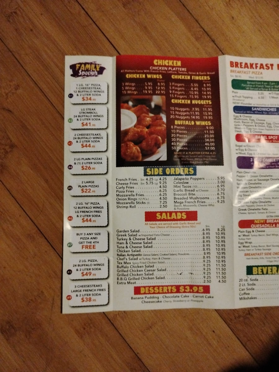 1 large 16" pizza, 1 cheesesteak, 12 buffalo wings and 2 liter soda.