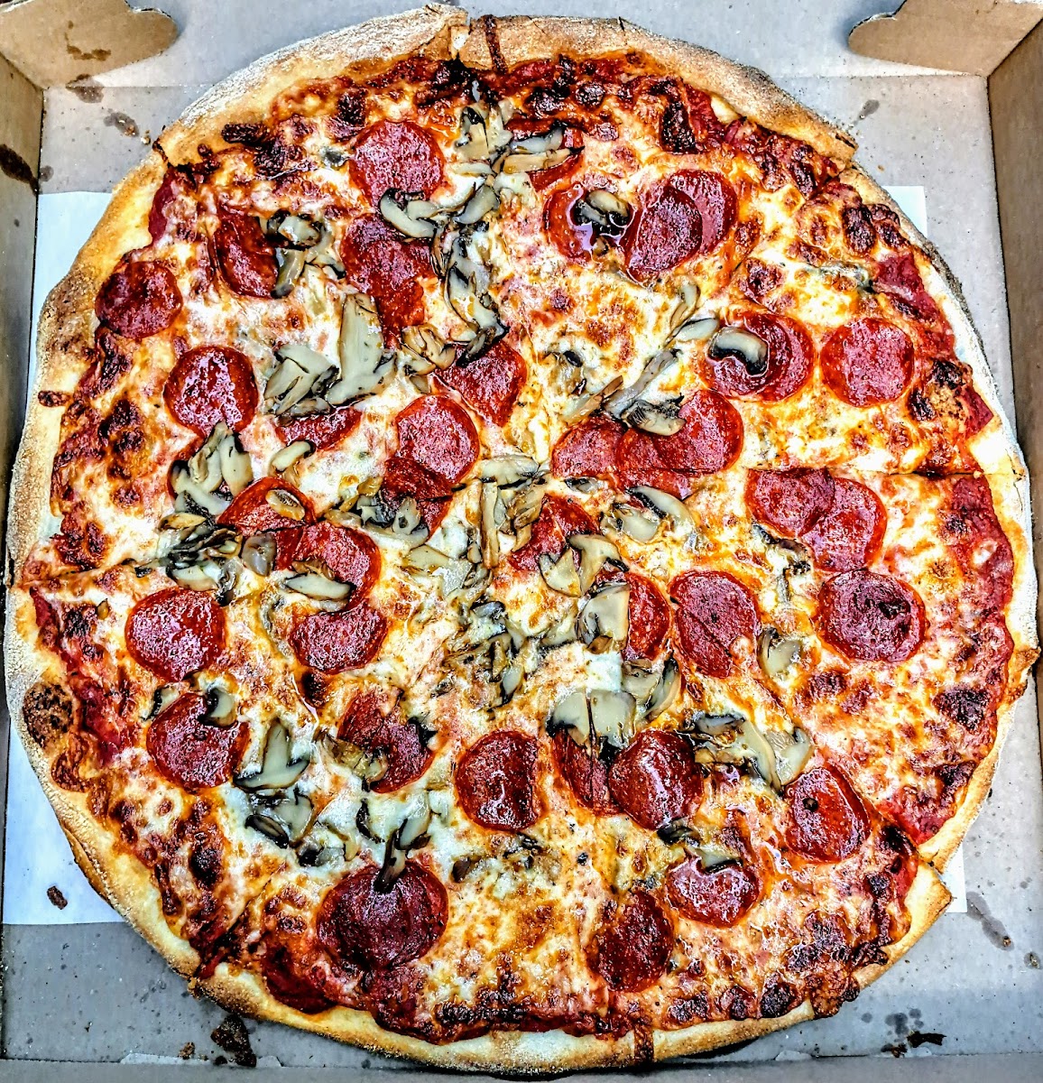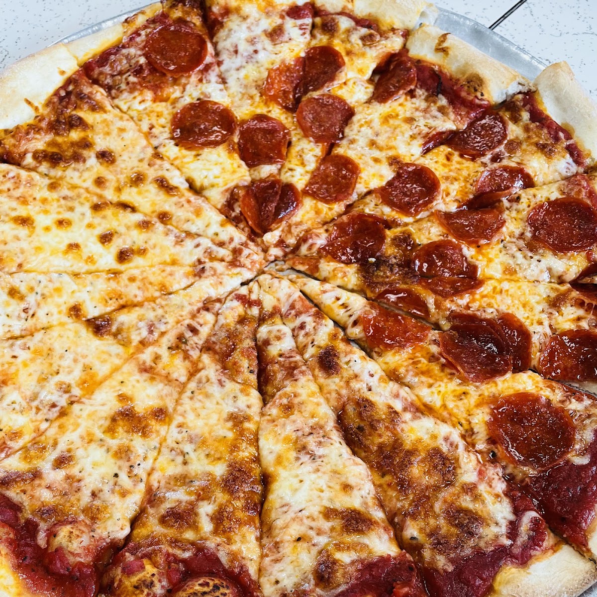 Love the pizza here!! So good and freshly baked! Got the pepperoni and cheese pie half and half and a buffalo chicken pizza (spicy but so good!) both were awesome! Friendly staff and quick service! Mozzarella sticks and garlic knots are good too! Highly recommended!