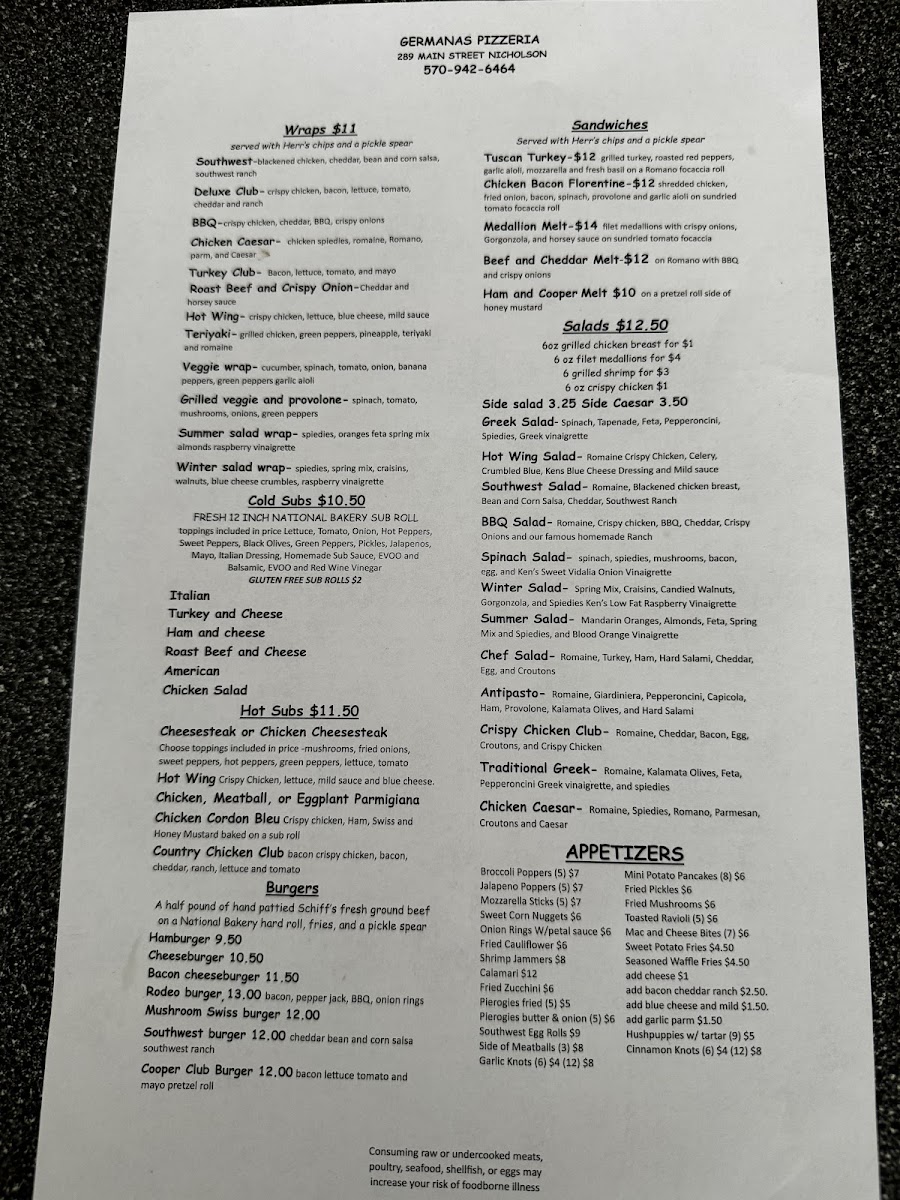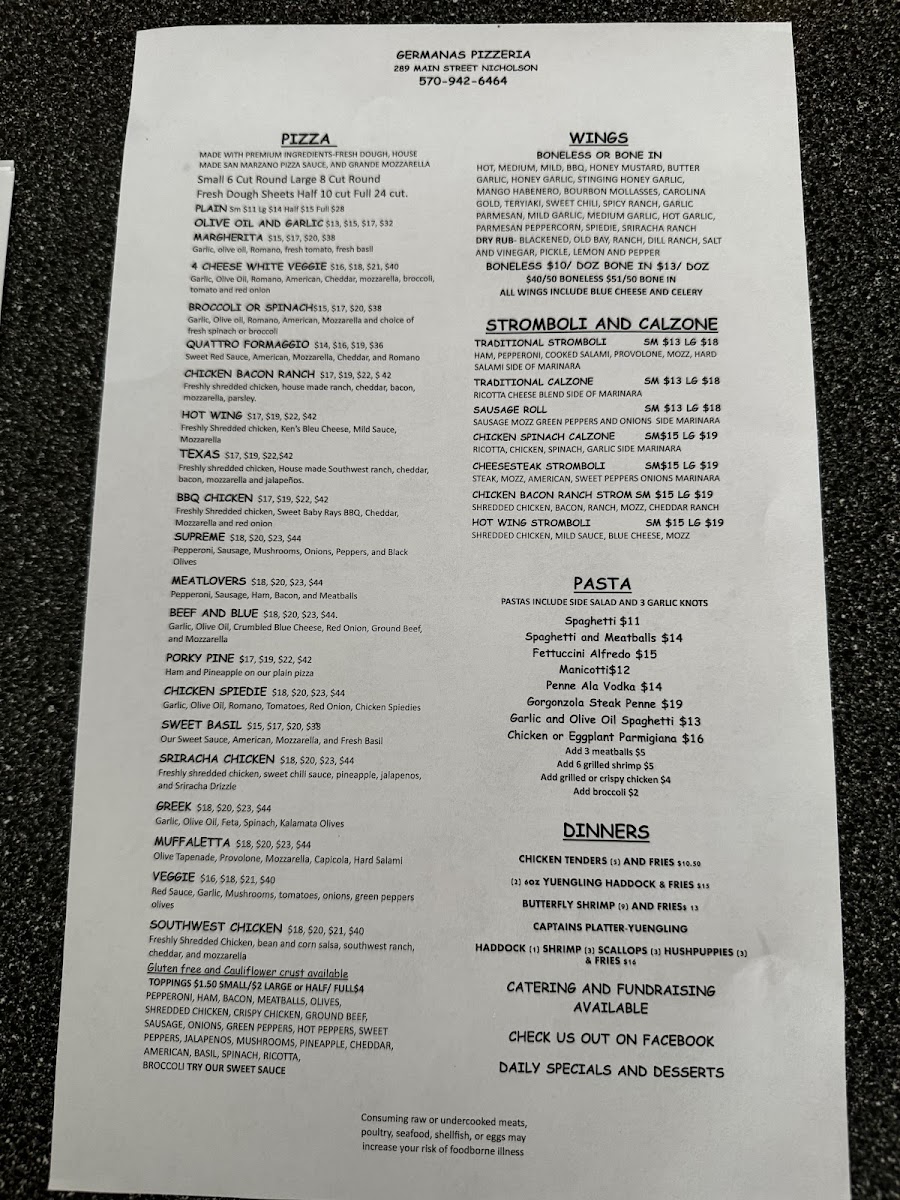Tomatoes, Onions, Greens, Hot or Sweet Peppers, Jalapenos, Black Olives, Broccoli, Garlic, Mushrooms, Fresh Spinach, Pineapple, Ham, Pepperoni, Sausage, Meatball, Bacon and Ground Beef, Olive Spread, Extra Cheeses - Feta or Blue Cheese. $1.50 small, $2 large/half sheet, $4 sheet. Chicken (Crispy or Grilled); Ribeye Steak Fresh Mozzarella $2.25/ small, $3/ large/half sheet, $6/ sheet