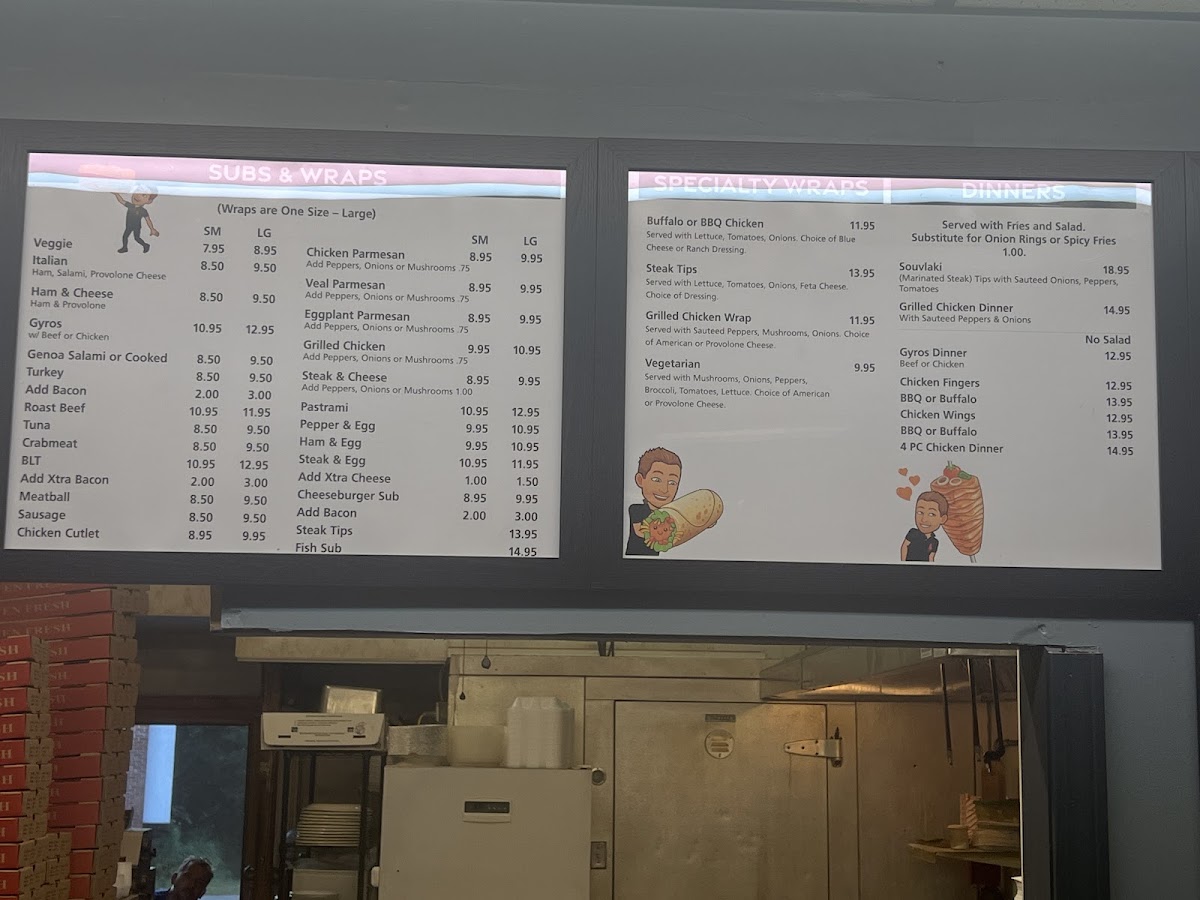 Very good food & service here with reasonable prices & lots to choose from! Pizza, pasta, calzones, appetizers, hot & cold grinders, + more. Fish available on Friday's! Place your order to go or dine in. Comfortable atmosphere. The owner is a very nice person with an outgoing personality who truly cares about his restaurant & customer's satisfaction. Always up for a friendly conversation & a few laughs. Knows the regulars & enjoys chatting with them. Staff is also terrific & motivated. Some of the things we'd recommend are the cheese pizza, chicken/broccoli alfredo meal, broccoli bites, chicken tenders/fries & grilled chicken, meatball, cheeseburg or Italian grinder. The baked goods are wonderful as well, especially the chocolate chip cookies! Would definitely recommend to anyone looking for a quick & tasty bite at a very fair price.