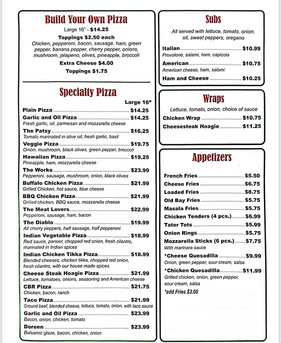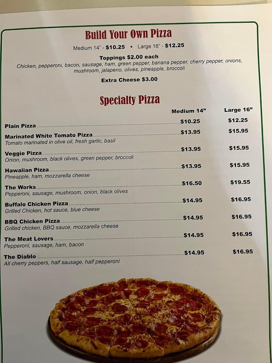 Chicken, pepperoni, bacon, sausage, ham, green pepper, banana pepper, cherry pepper, onions, mushroom, jalapeno, olives, pineapple, broccoli