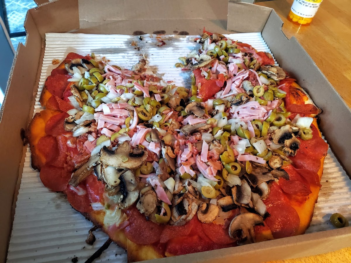 It’s take out only bit the best pizza ever!! And a little different from the average pizza