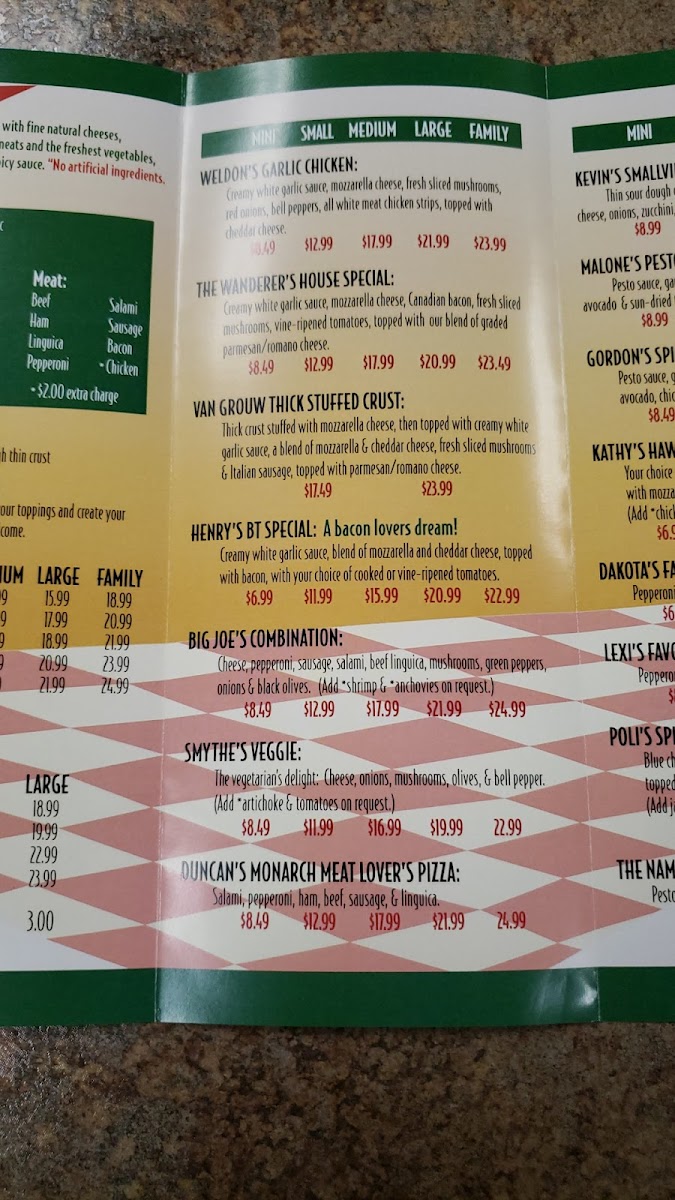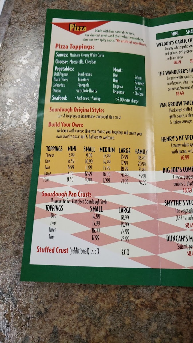cheese, pepperoni, sausage, salami, beef linguica, mushrooms, green peppers, onions and black olives, shrimp and anchovies on request
