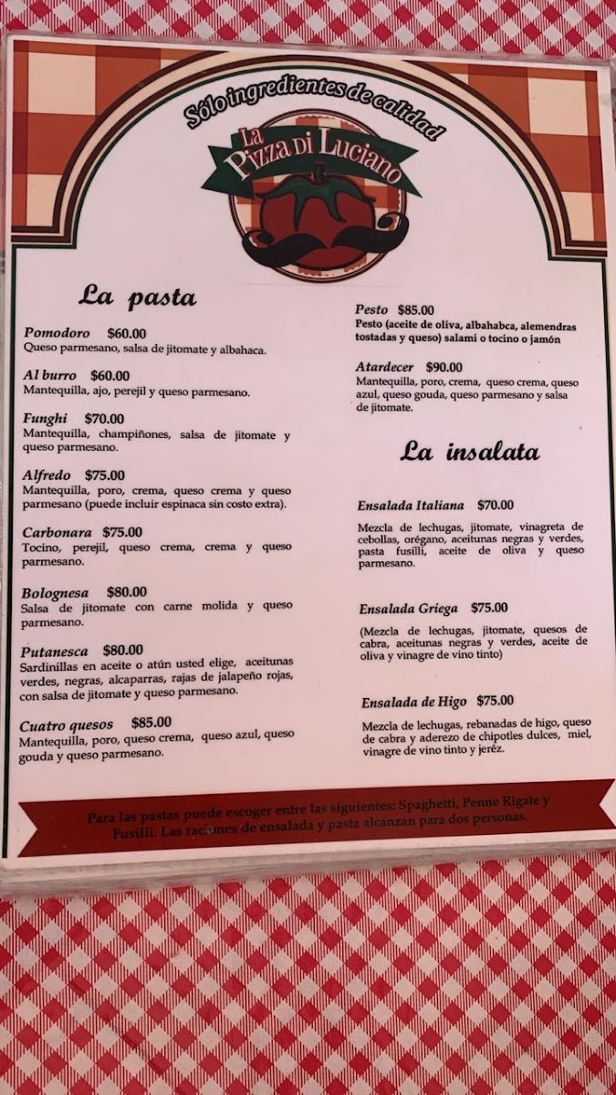 Mezcla de lechugas, jitomate, vinagreta de cebollas, orégano, aceitunas negras y verdes, pasta fusilli, aceite de oliva y queso parmesano.