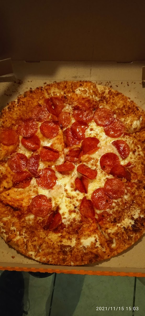 Se tardaron en darme una pizza de peperoni con orilla rellena de queso.... de echo tuve que dar dos vueltas para que me la entregaran.