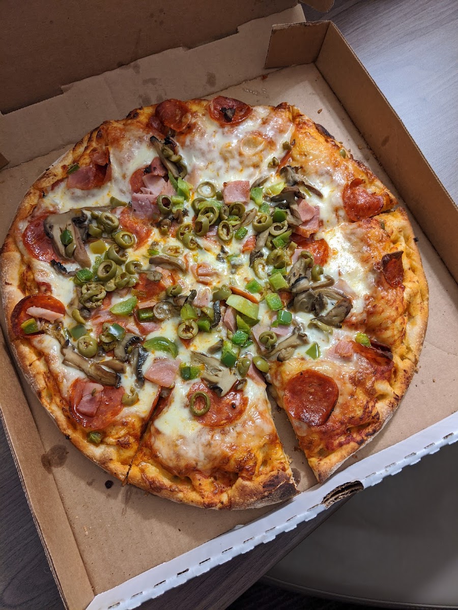 Solid pizza place. Good quality round pizza with multiple topping options. Vegetarian pizza options. Staff were kind. Recommended that you walk in to order cause they are usually very busy at meal times.
