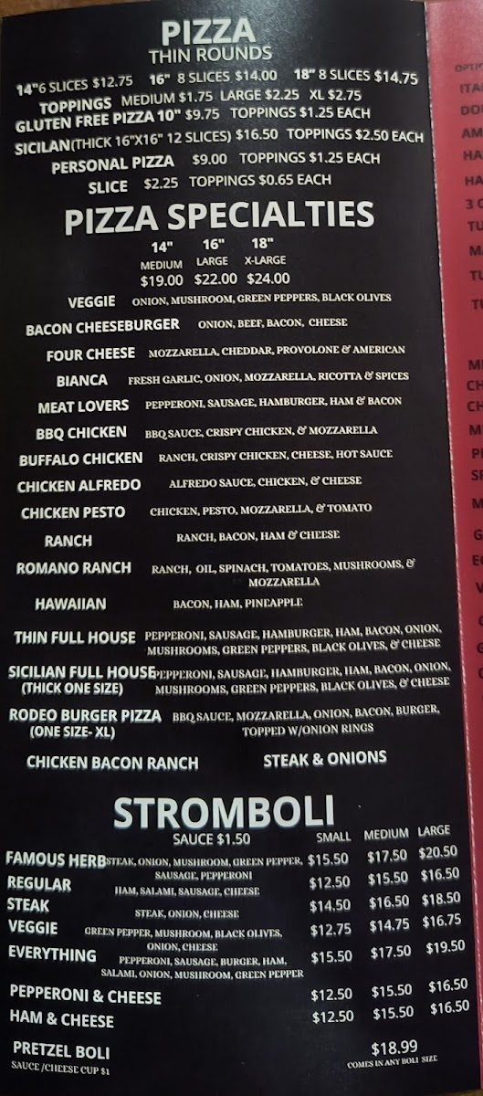 Pepperoni, sausage, hamburger, ham, bacon, onion, mushrooms, green peppers, black olives, & cheese.