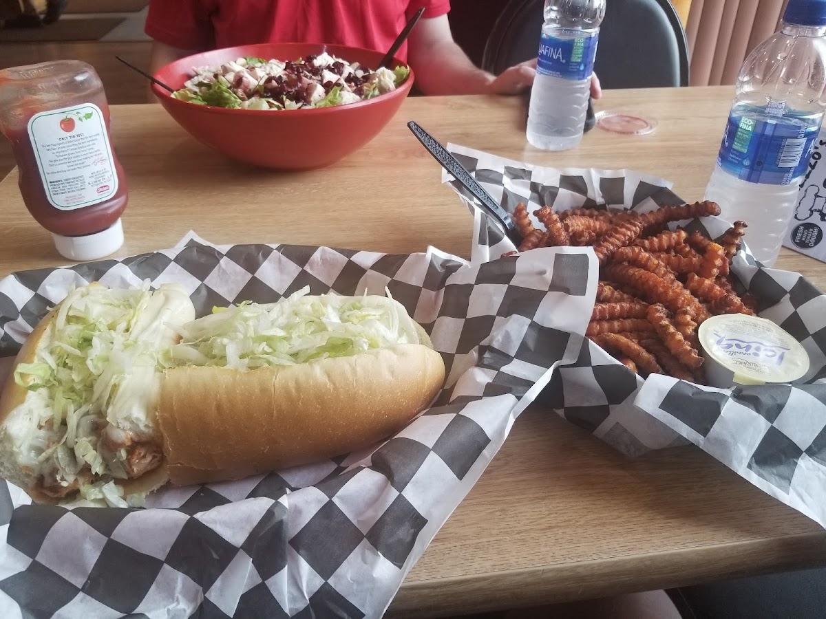I am not from this area and just happened to pass by when my nephew said he was hungry so went back and ordered take out. I got a cheesesteak hoagie with onoin and mushrooms with sauce and a chicken almond raisin salad both were very good. My nephew had sweet potatoe fries he always likes anywhere and also a chicken salad which he enjoyed also. The owner I'm amusing was very nice. It's a small place on a corner. If I happen to pass by that way again I will definitely stop. Food was very good.