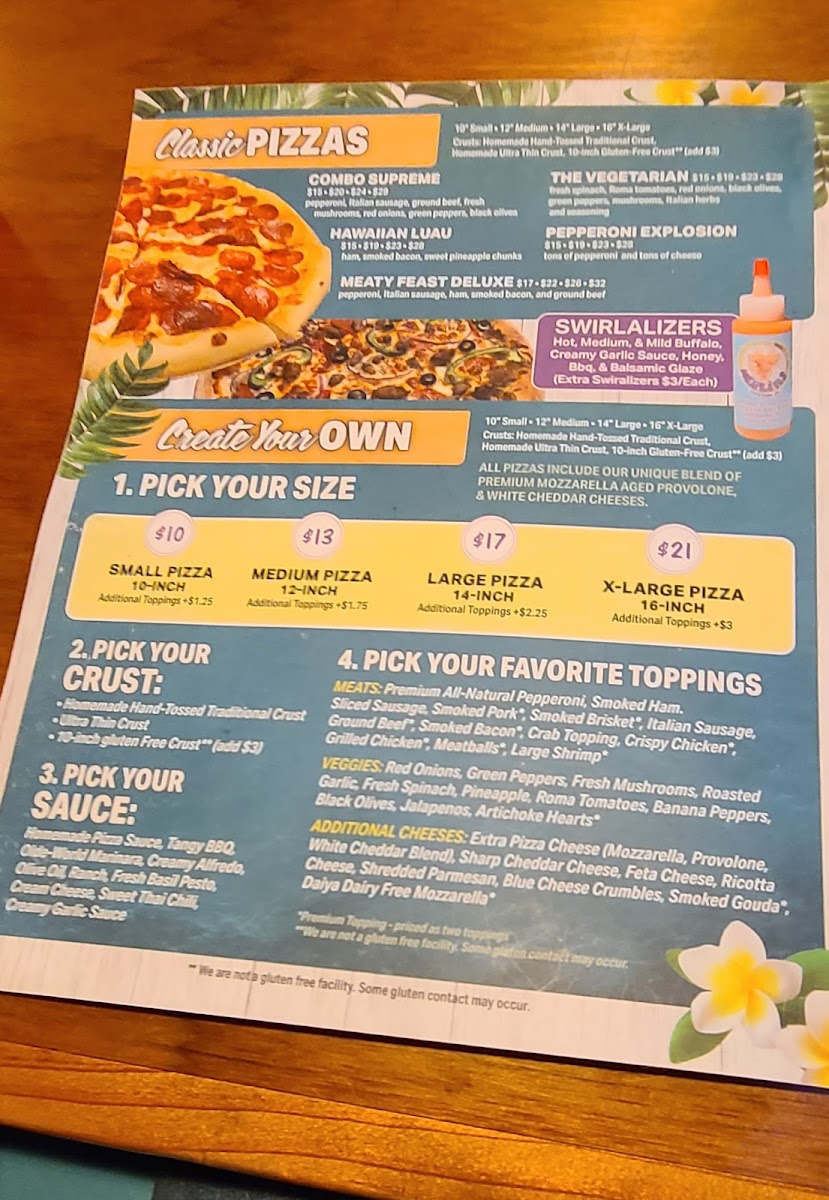 Why go to Tahiti? This pie will make you imagination run wild. Its made with tangy BBQ sauce, slow smoked pulled pork, fresh sliced red onions, green peppers, mushrooms, and sweet chunks of pineapple. We top it off with our premium blend of pizza cheeses, smoked bacon, and a dusting of blue cheese crumbles.
