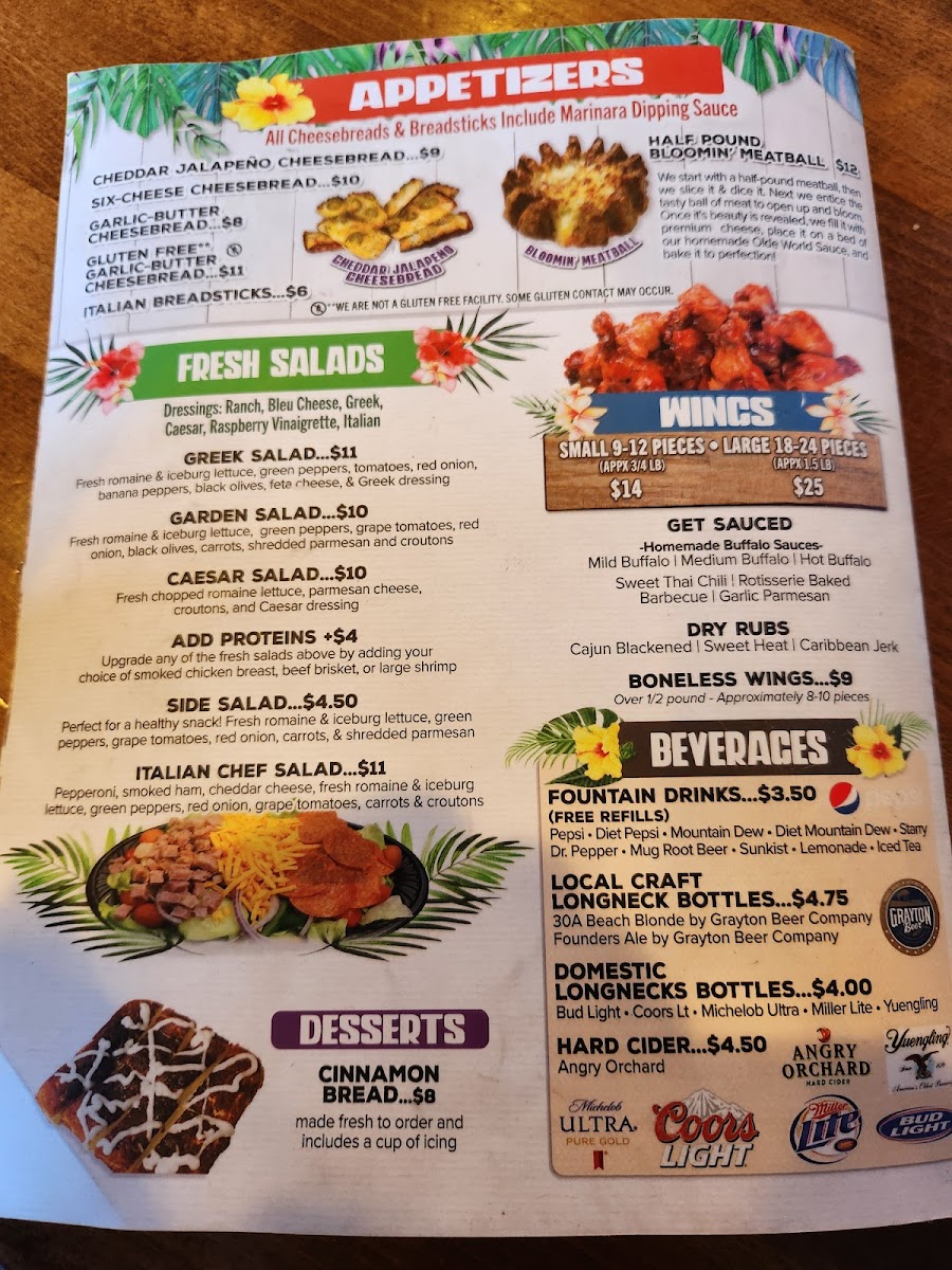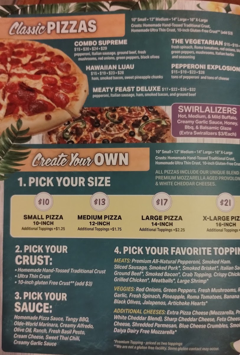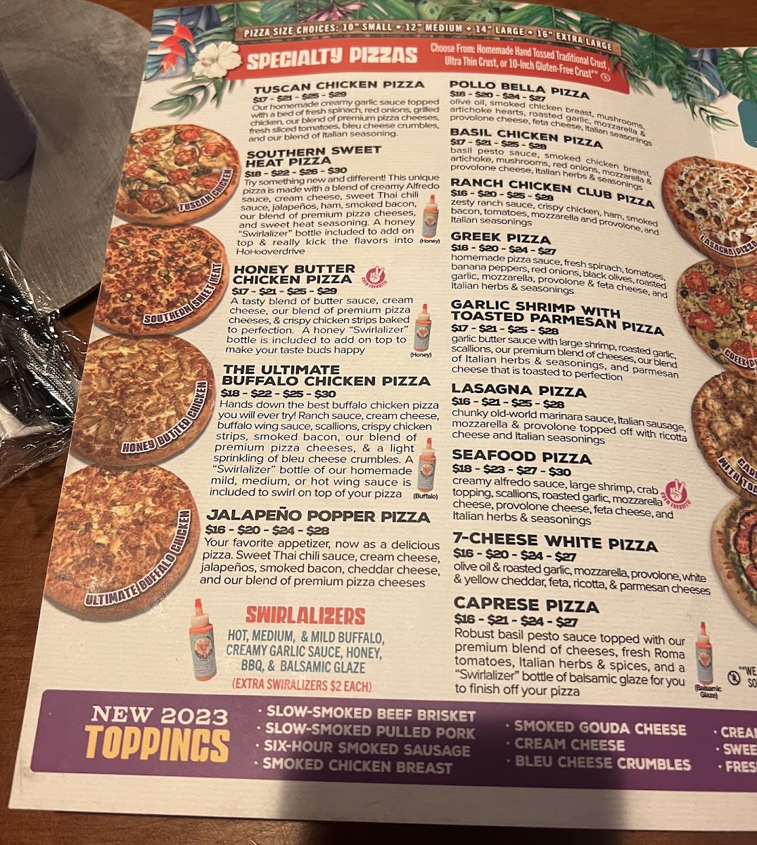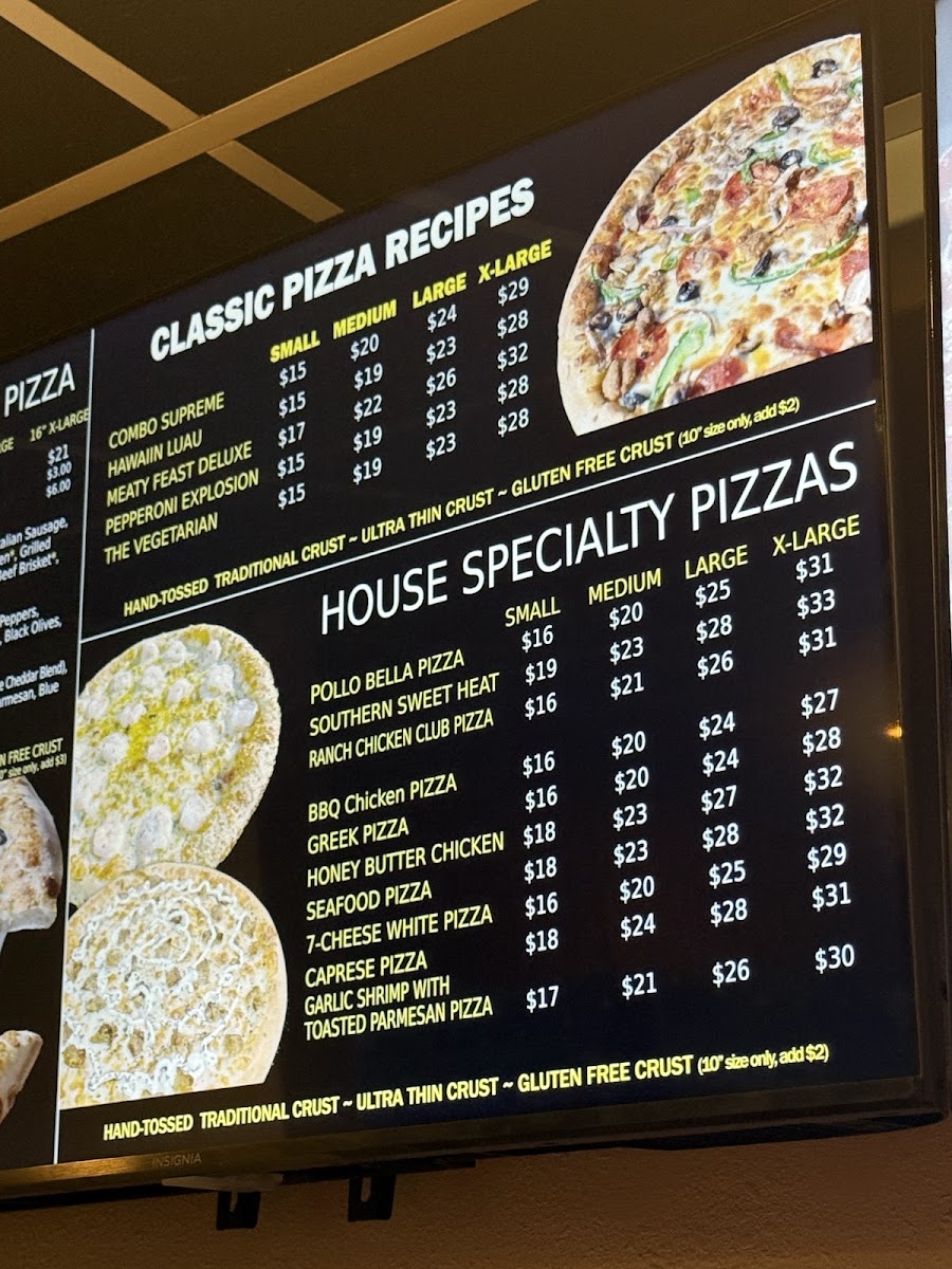 Our homemade creamy garlic sauce topped with a bed of fresh spinach, red onions, grilled chicken, our blend of premium pizza cheeses, fresh sliced tomatoes, bleu cheese crumbles, and our blend of Italian seasonings
