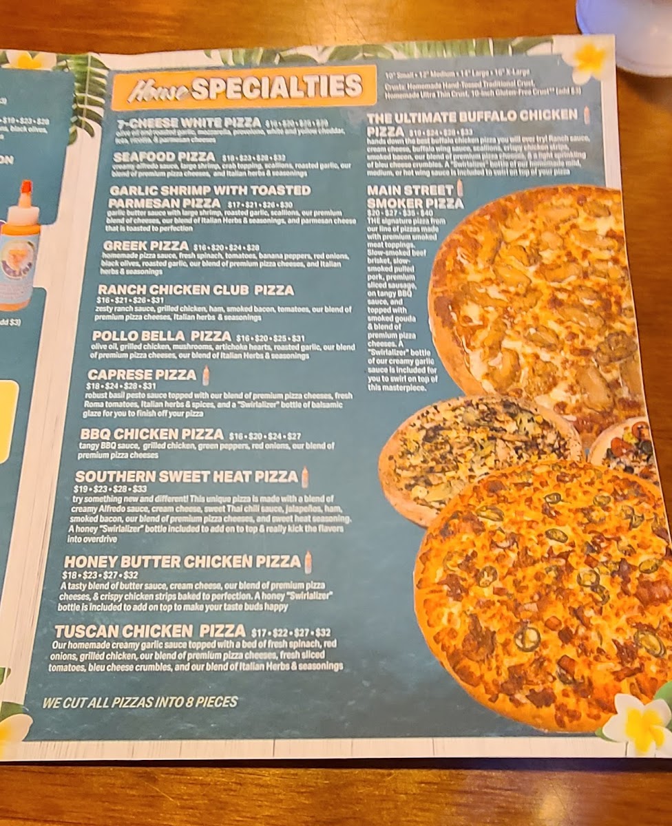 Try something new and different! This unique pizza is made with a blend of creamy Alfredo sauce, cream cheese, sweet Thai chili sauce, jalapenos, ham, smoked bacon, our blend of premium pizza cheeses, and sweet heat seasoning. We include a squeeze bottle of honey for you to swirl on your pizza to really kick the flavors into overdrive.