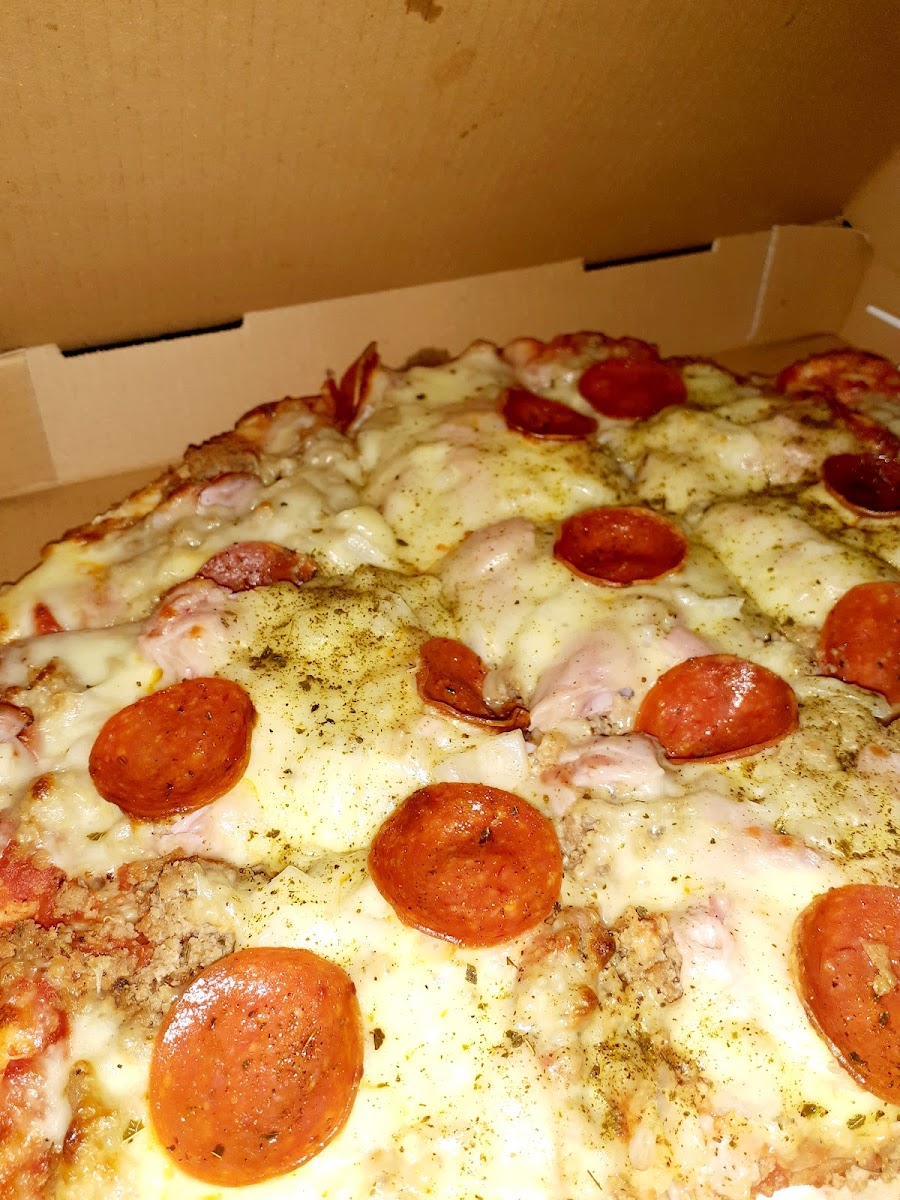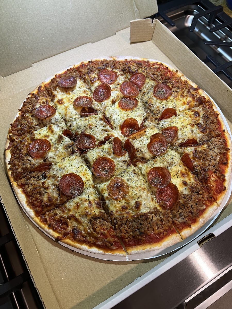 Omg great pizza and I couldn’t eat but a piece and a half. It was so loaded with toppings and I highly recommend them you have to try it. Really good