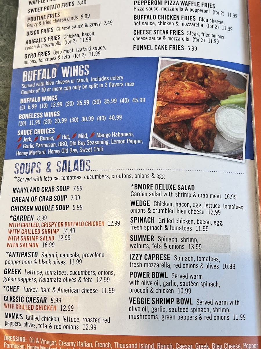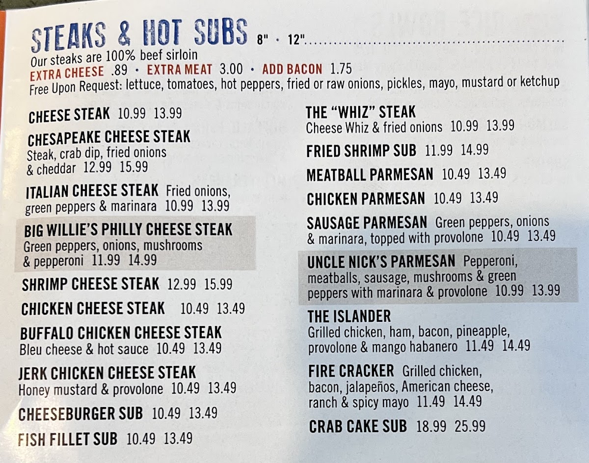 A baltimore favorite. Ribeye steak meat mixed with homemade crab dip and topped with cheddar cheese on a toasted roll.