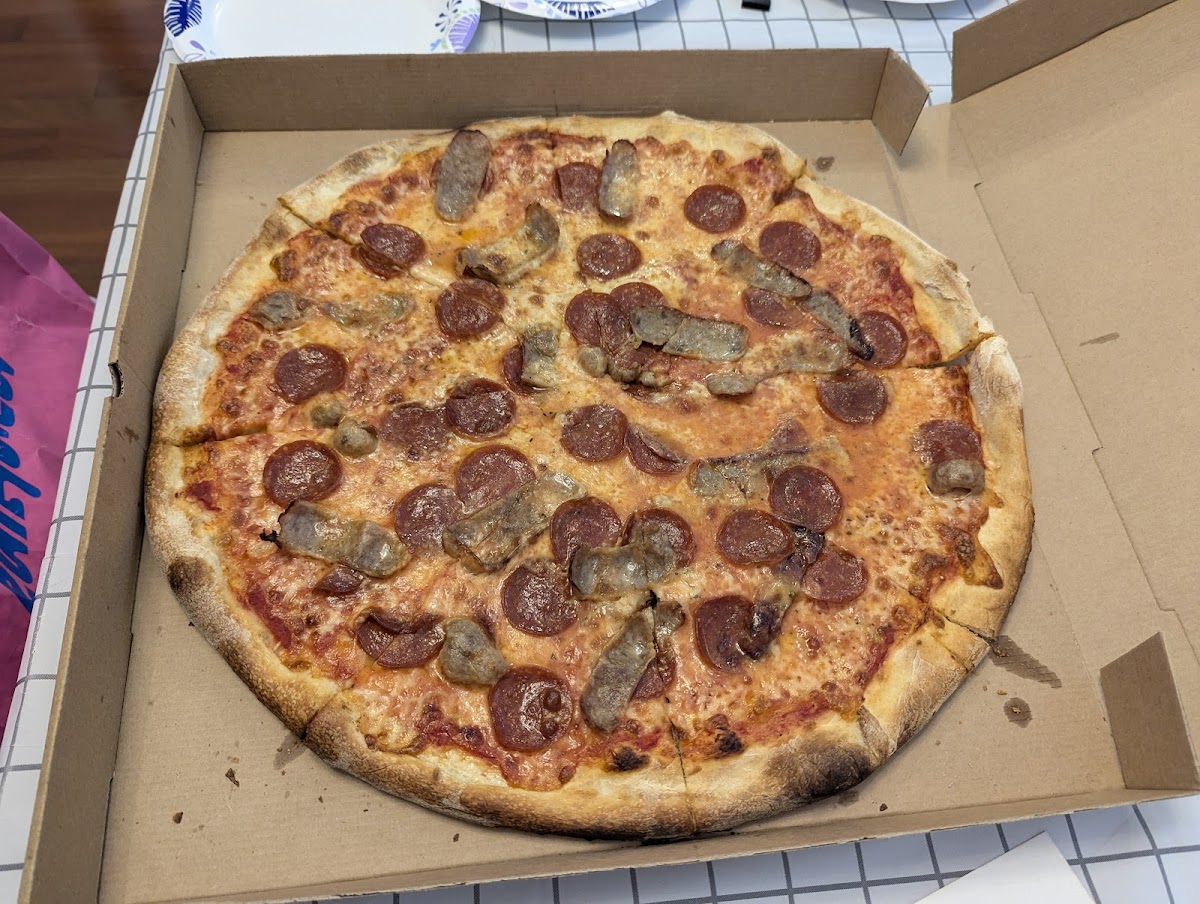 Just your typical pizza with a layer of oil on top. Pepperoni and sausage were standard and didn't have a strong taste