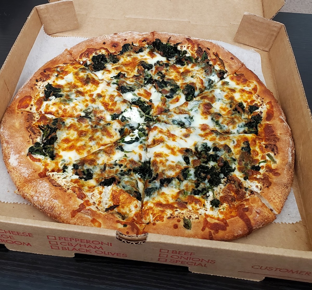 Reminds me of pizzerias from back in NJ. No frills, if you're looking for fad toppings (figs, caviar, buffalo chicken, cheese steak....ECT) this isn't the place for you (although they do have a Hawaiian pie). But if you're in the mood for traditional NY style pies, give them a shot, you won't be disappointed. We got a plain pie and a white w/spinach, both delicious, we'll definitely be back.