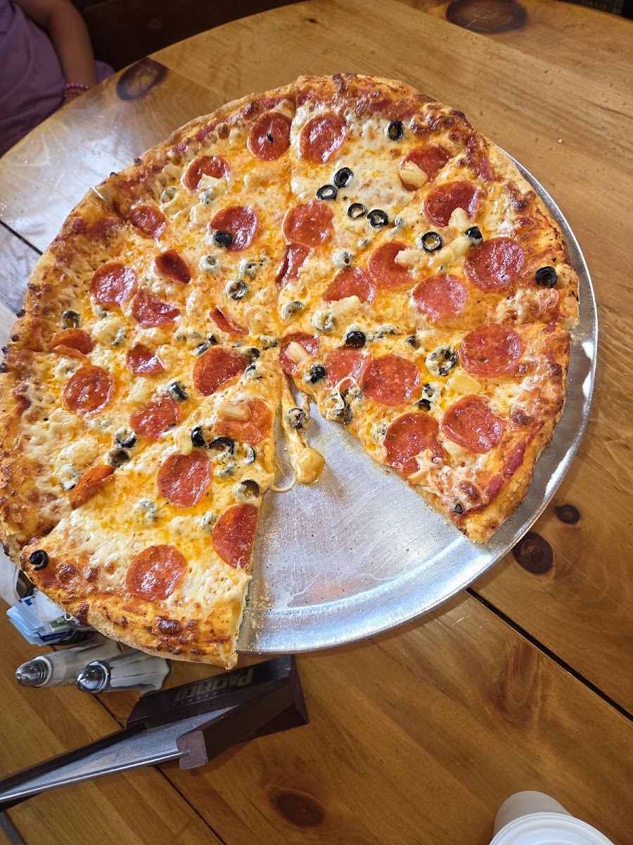 The pizza was great and views were spectacular from the covered patio. The only negative was the lack of fans out on the patio and inside the restaurant was even hotter. It was about 90F while we there and the only cool place was the restroom. We'll be back but it will be when it's cooler.