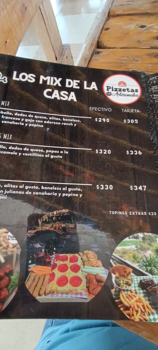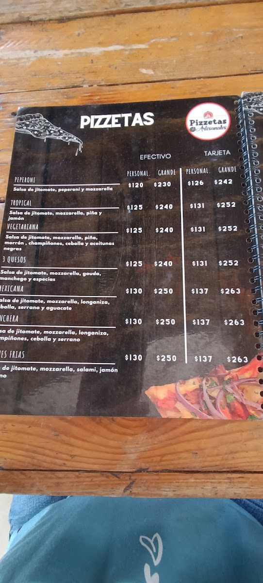 Pizzas con salsa de jitomate, mozzarella, longaniza, cebolla, chile serrano, aguacate, catsup, salsa de la casa picante y tamaño elegir.