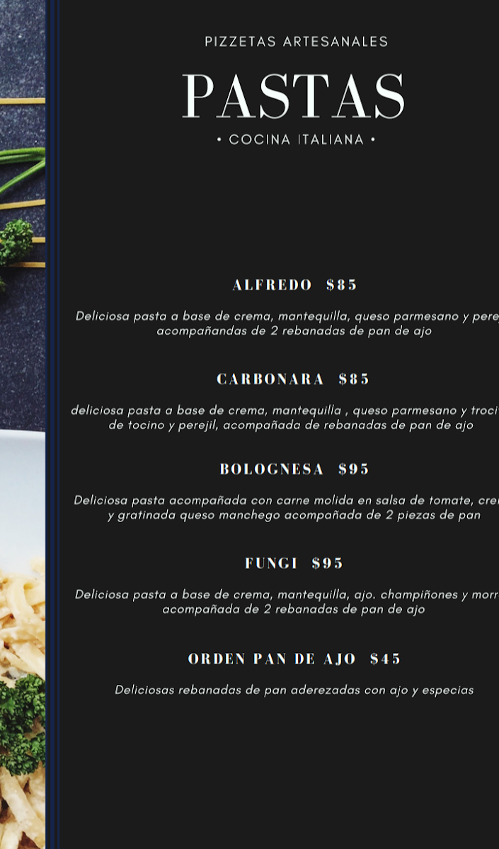 250 gr de pasta con base crema, 2 piezas de pan de ajo, mantequilla, queso parmesano y preparación a elegir.
