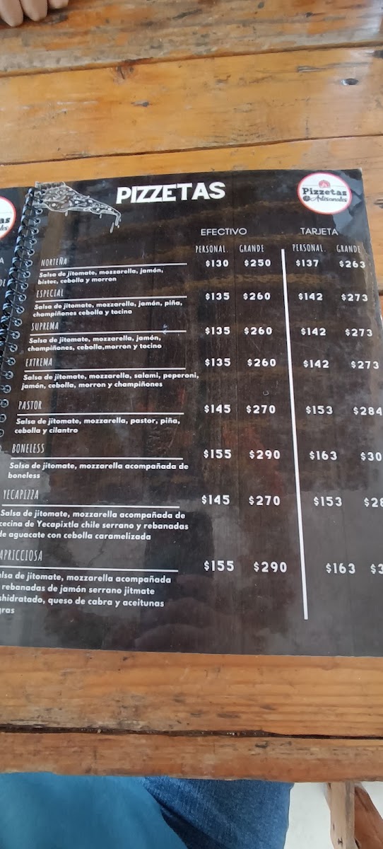 Pizzas con salsa de jitomate, mozzarella, jamón, piña, champiñones, cebolla, tocino, catsup, salsa de la casa picante y tamaño a elegir.
