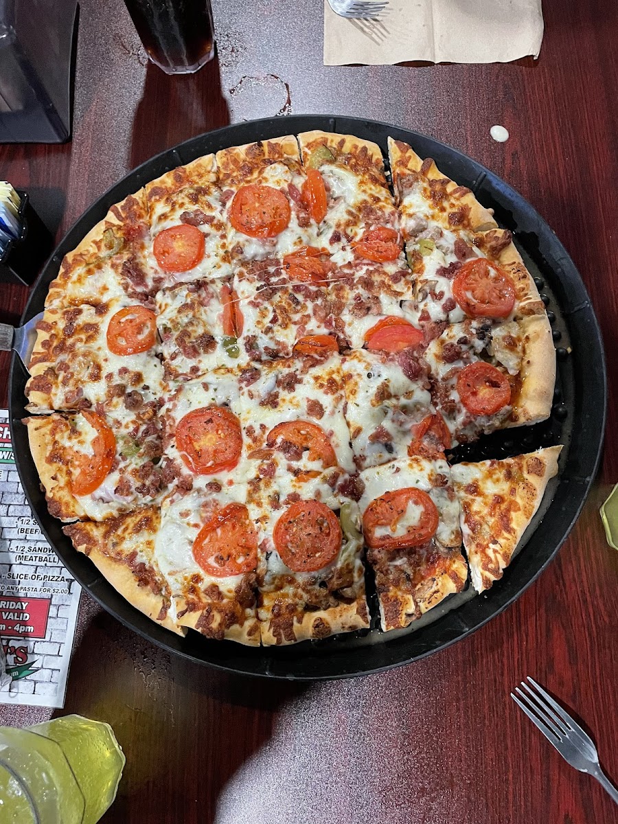 My first time here. The Calzone I ordered was really good and pretty good size as well. I got it with Italian Sausage and Green Peppers. If I were going to complain I would say the bottom was a little hard to cut but couldn't tell it when eating it. The employees were nice. Reasonably priced considering the portion size.
