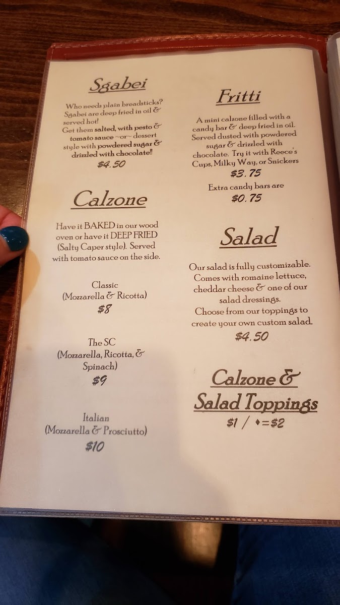 A mini calzone filled with a candy bar and deep fried oil. Served dusted with powder sugar and drizzled with chocolate ask for today's choices.