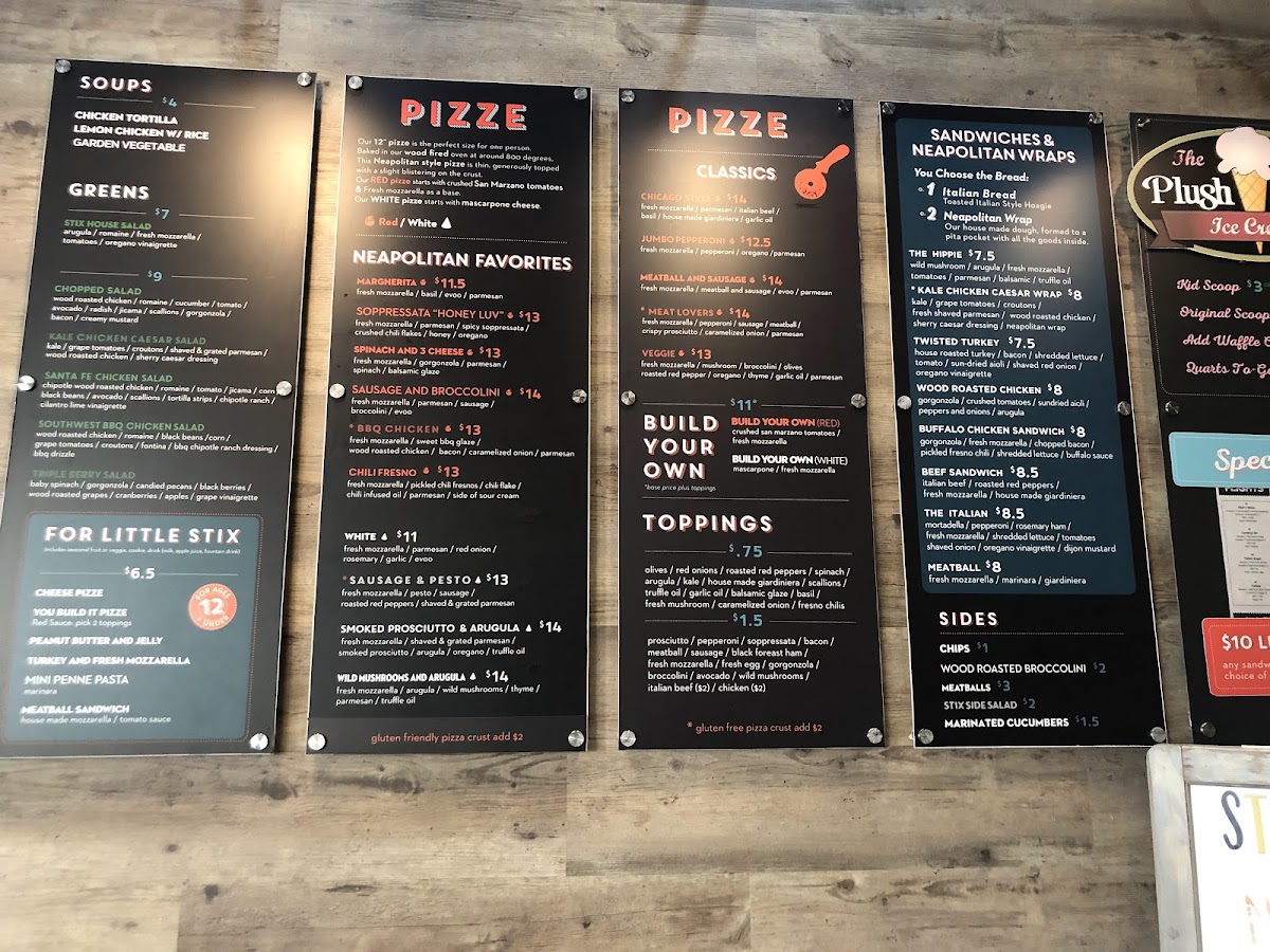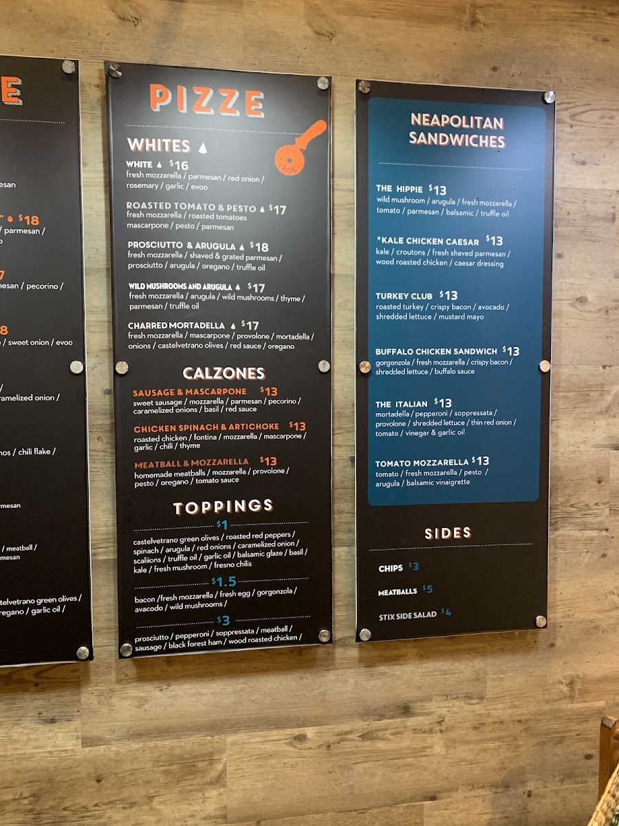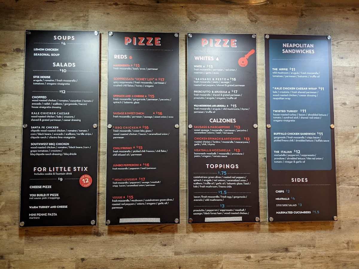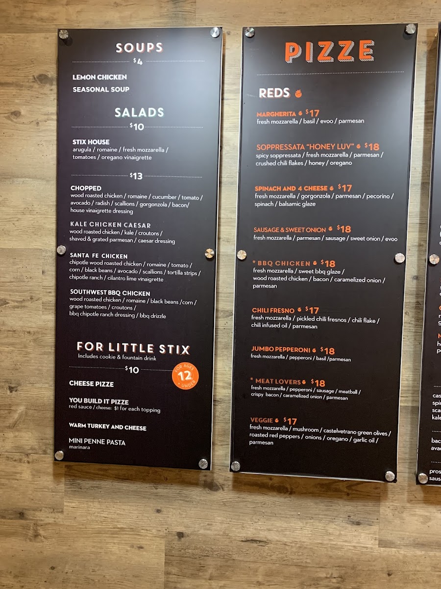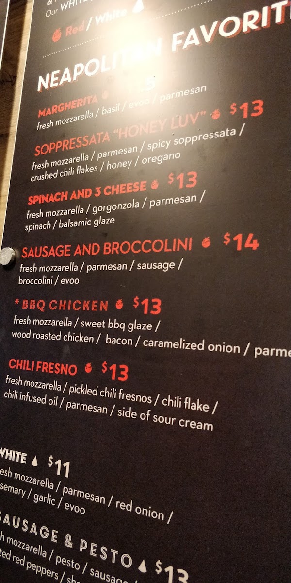 Red. Fresh mozzarella, Parmesan, spicy soppressata, crushed chili flakes, honey, and oregano