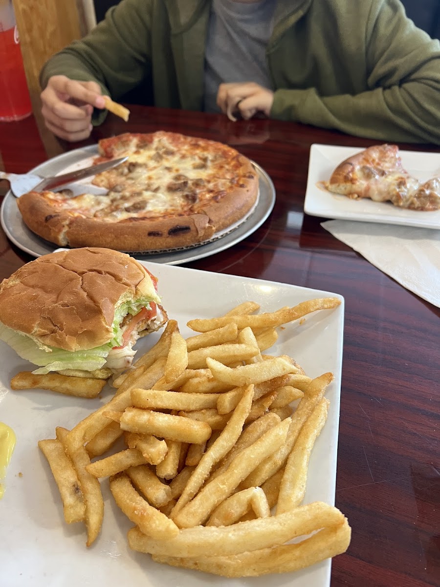 Found this spot on a whim. Such a nice spot for simple good food. I had the chicken crispy sandwich it was good. And the cheese pizza is super cheesy. Also a huge plus for us the place is really clean!