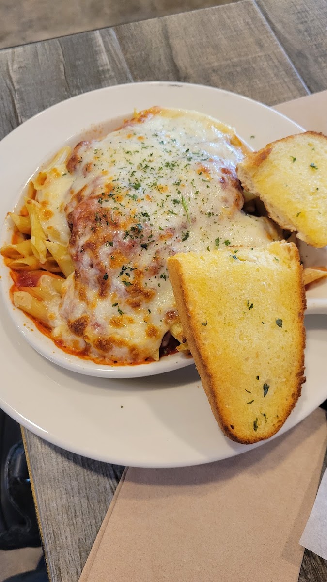 First of all let me start by saying the bread is the best bread in town they aren’t giving false advertisement at all! The pizza was great! Plenty of toppings they are not stingy at all with their toppings! The lasagna oh may oh may it’s amazing! It had prefect flavor also you get more bread with the lasagna. We also order the wings with the sauce on the side cause we couldn’t decide on one flavor so we got the garlic and parmesan sauce and also the mild buffalo sauce! And yes the garlic Parmesan sauce was a winner! The wings had a prefect crisp to it they were well cooked to perfection! The food was all delicious it was a winner for sure! The customer service was also fantastic! The lady was so friendly and welcoming! Also the atmosphere was nice liked the setup plenty of tv’s perfect for game days and the there bar looked like they had plenty selection of drinks even tho we didn’t get any alcohol still looked great. I highly recommend this place! We will definitely be coming back!