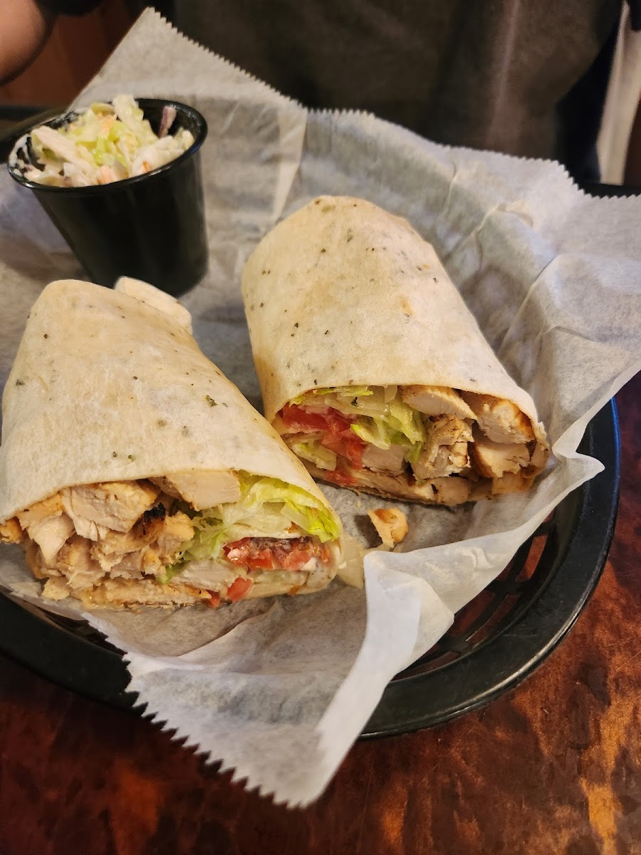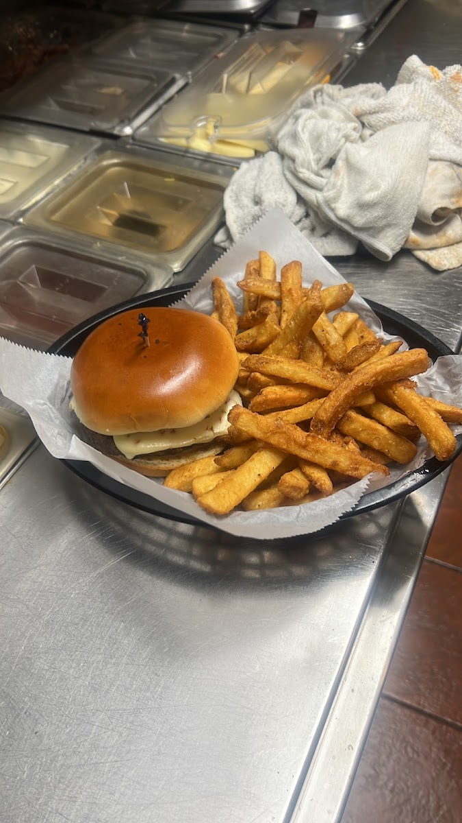I had a California burger with fries. The burger was very big and delicious. The fries had good seasoning on them and were very crispy. My partner had a chicken club wrap with Cole slaw, he said they were both very good. We can't wait to go back and try many other things off the menu. I got a slice of apple peach cobbler to go, very good!