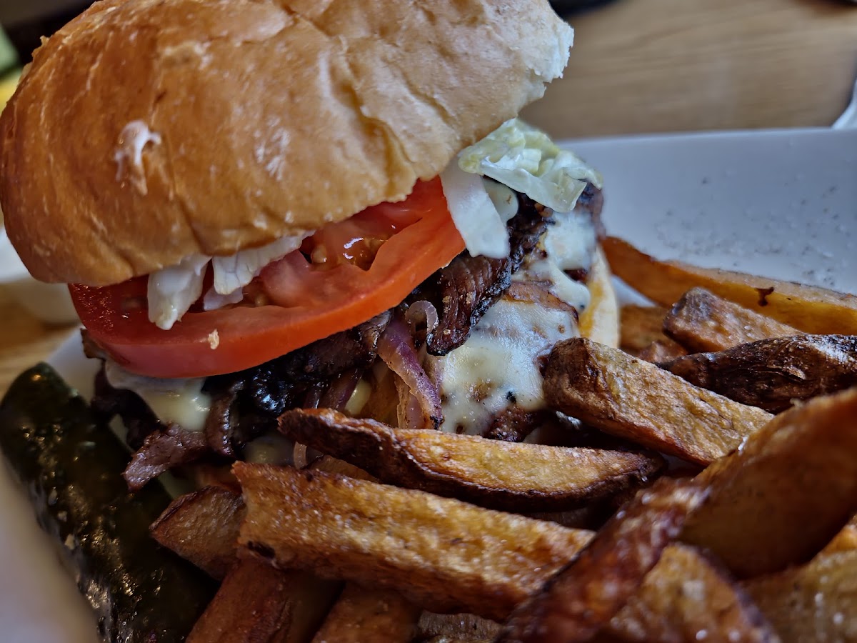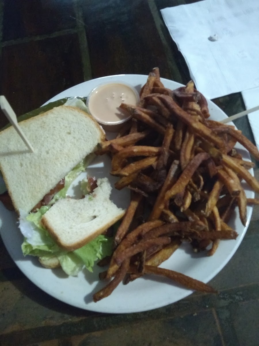 BLT fries a little burnt but they replaced them quick and for me on a BLT the bread should be a little more toasted but tasted good, & no hair in it and bartender very friendly and personable. Place clean bathroom clean although I don't know what the little bags were for in the restroom