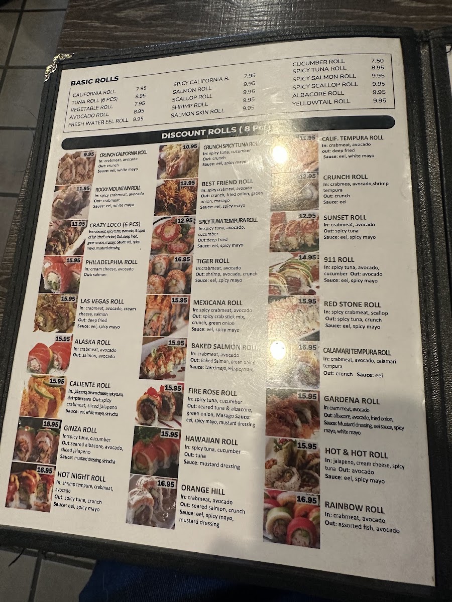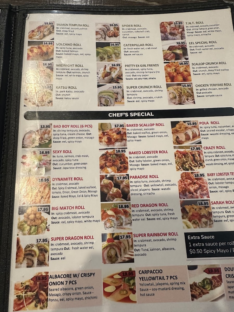 In: crabmeat, spicy tuna, salmon, tuna, tilapia, avocado Out: deep fried, spring mix Sauce: wasabi dressing, eel, spicy mayo