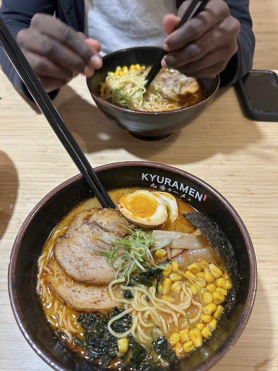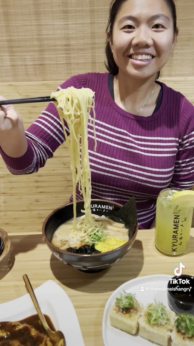I’ve been meaning to checkout Kyuramen for a while now and finally got the chance! I had a wonderful experience here. We started with the takoyaki, which was honestly some of the best I've ever had. My personal pet peeve with Takoyaki is I feel like a lot of restaurants don't cook theirs long enough. But the ones at Kyuramen were the crispiest I've had. The inside is still custard-like, but it doesn't taste straight up raw like some others that I've had before. Next, the teriyaki beef burger was also really delicious. The beef was super tender and had incredible grilled flavor. It's a little messy to eat, but they provide gloves, which we appreciated. Now, onto the ramen. In my opinion, DFW isn't known for spectacular ramen; the best ramen I've had was when I was traveling. However, as a local restaurant, Kyuramen hits the spot. The broth was pretty good, the ramen egg was flavorful and perfectly jammy, and the chashu was super tender with a nice char. In addition, the noodles had a great texture, and the toppings were plentiful and delicious. I got the Tokyo Tonkotsu Shoyu Ramen, and my sister ordered the Mega Ramen. I actually liked hers more and would probably get that next time. Beyond the food, the atmosphere here is really unique. There is plenty of seating, ranging from tables, a bar area, and the honey comb booths, which are the main attraction here. We sat in one of the honeycomb booths, which gave us a nice, private dining experience. There's a call button to get your waiter's attention, but other than that, you're left alone, which I personally like sometimes. However, that being said, the staff here were still very friendly and helpful. As for pricing--I've been to several Japanese restaurants in DFW, and I'd say the prices here are comparable. It's by no means a super cheap place to eat at, but I personally don't think it was more expensive than other Japanese restaurants I've been to. Especially for the pricing of ramen, the range is very much on par with its counterparts. Overall, I'd definitely recommend this place, and I'd love to bring my family here again.