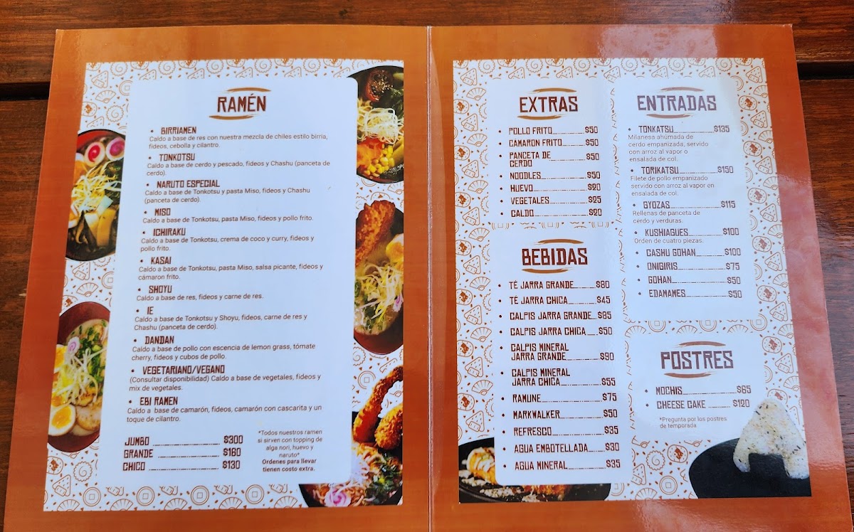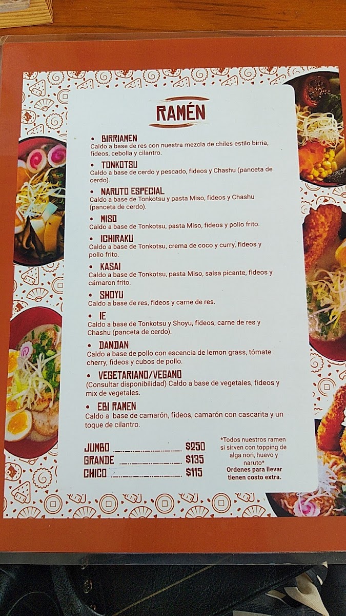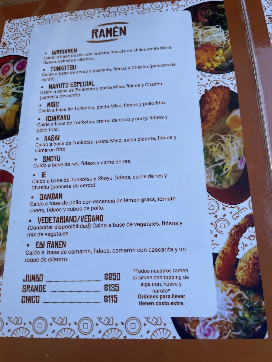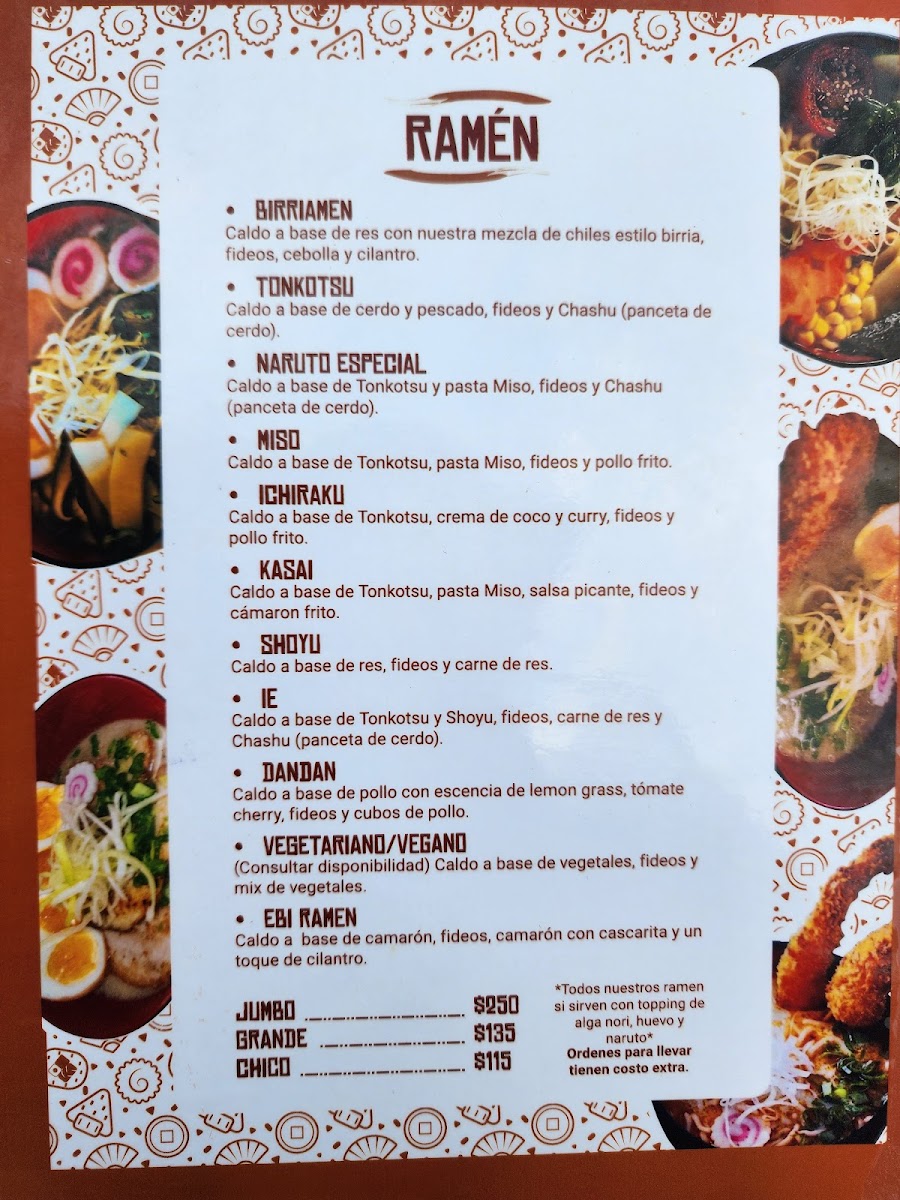 Caldo de res con fideos, carne de res, alga nori, huevo, naruto, salsa y tamaño a elegir.