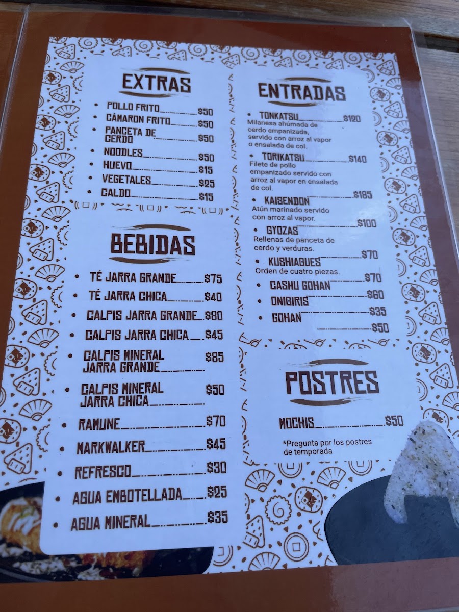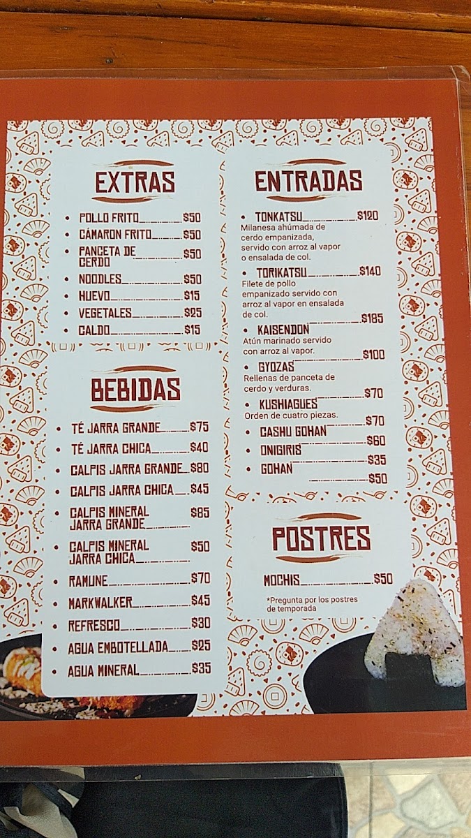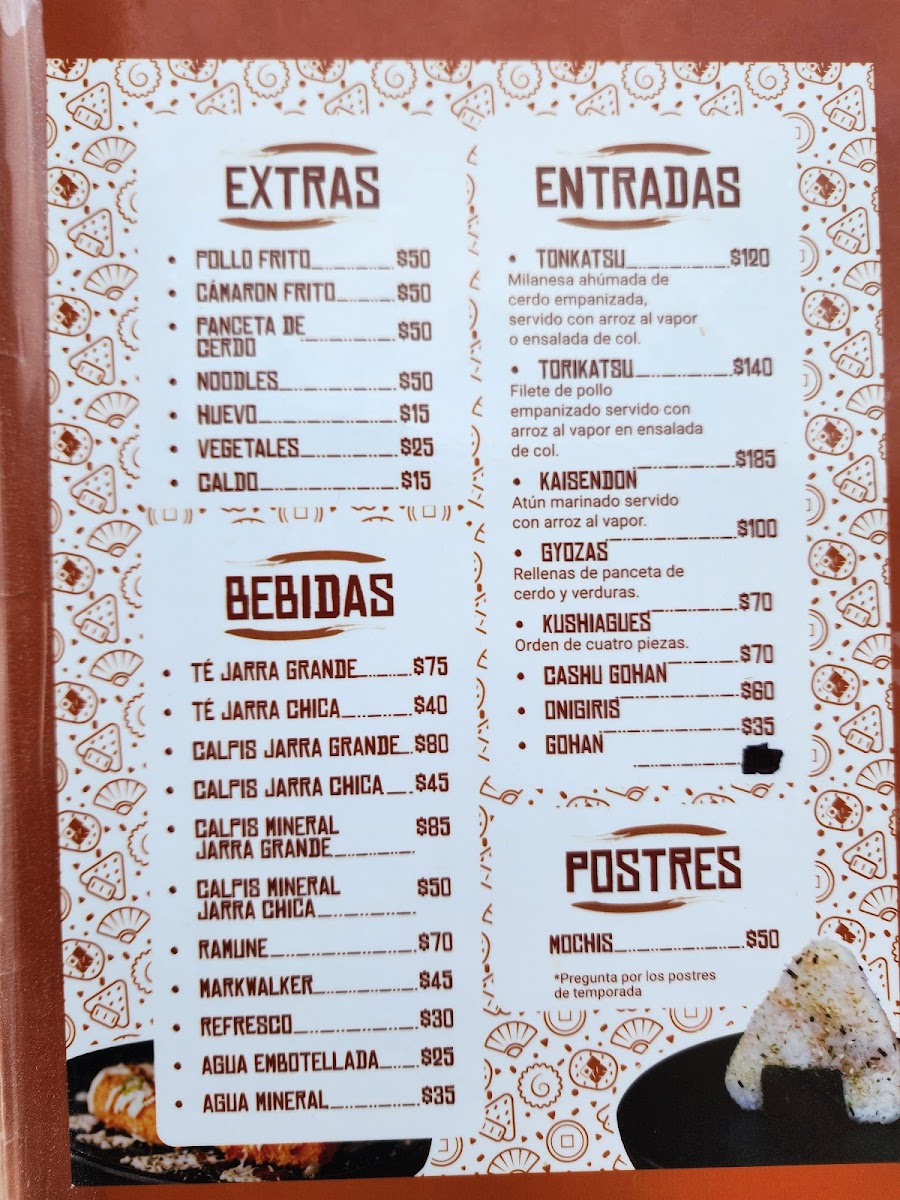 Caldo base tonkotsu con pasta miso, salsa picante, fideos, camarón frito, alga nori, huevo, naruto, salsa y tamaño a elegir.