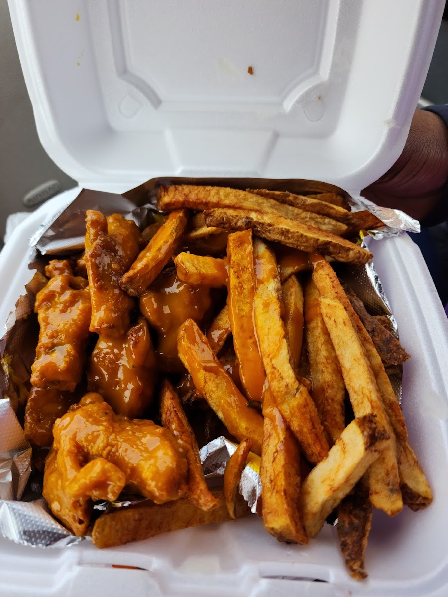 Get got 6 wing ding and fries, and loaded chicken fries. I really enjoyed the Carolina Golden sauce, put it on our wings and loaded fries. Everything was made fresh so it was a 25 minute wait. But with good food you going to wait. 9/10 on customer service