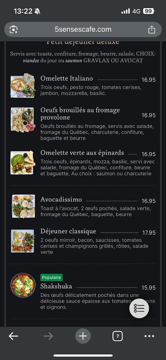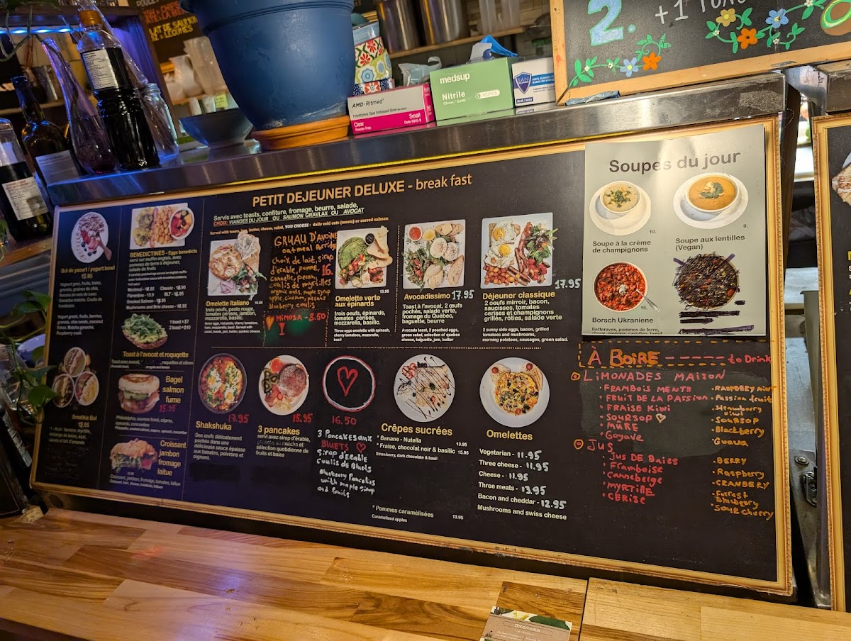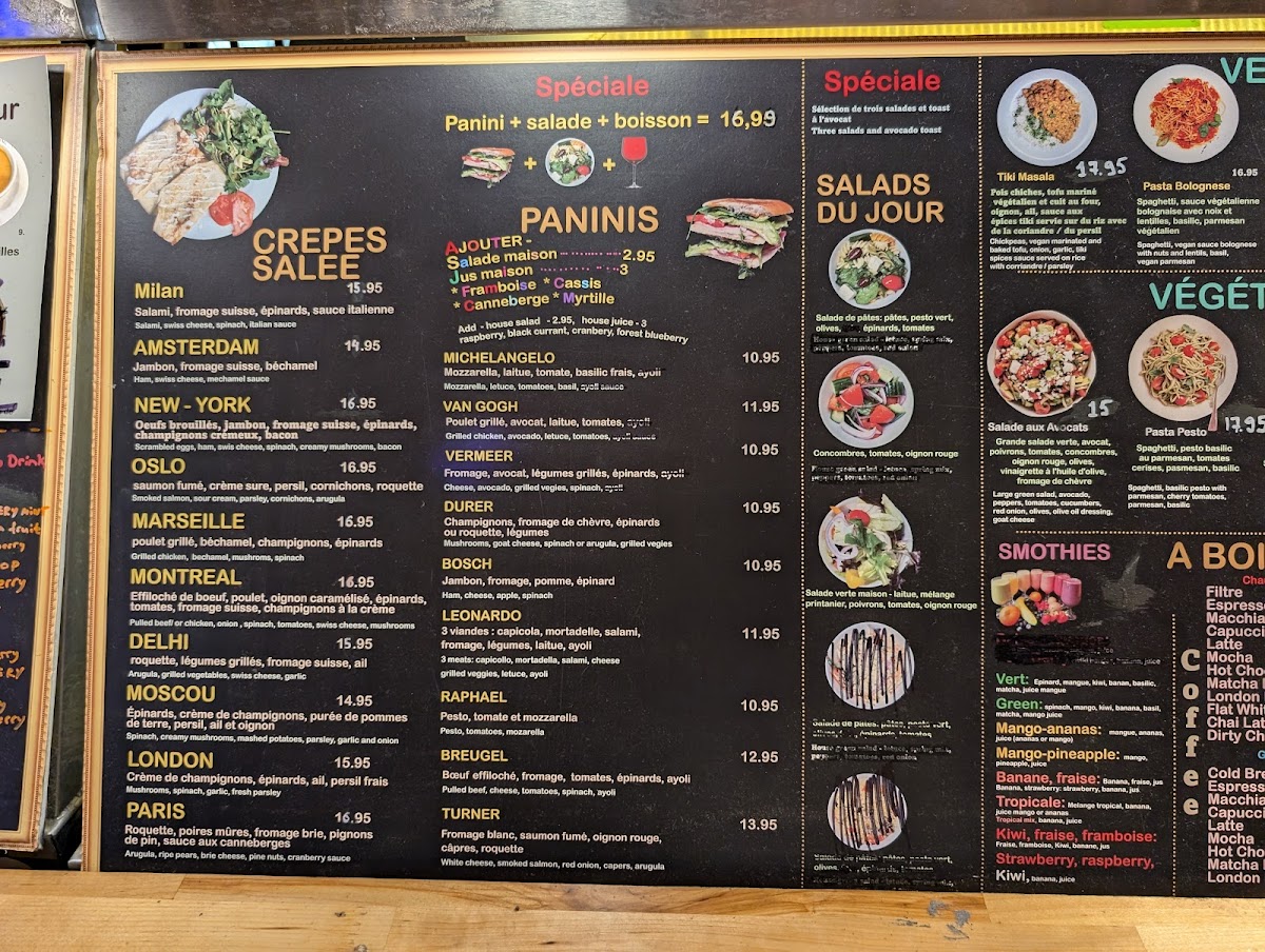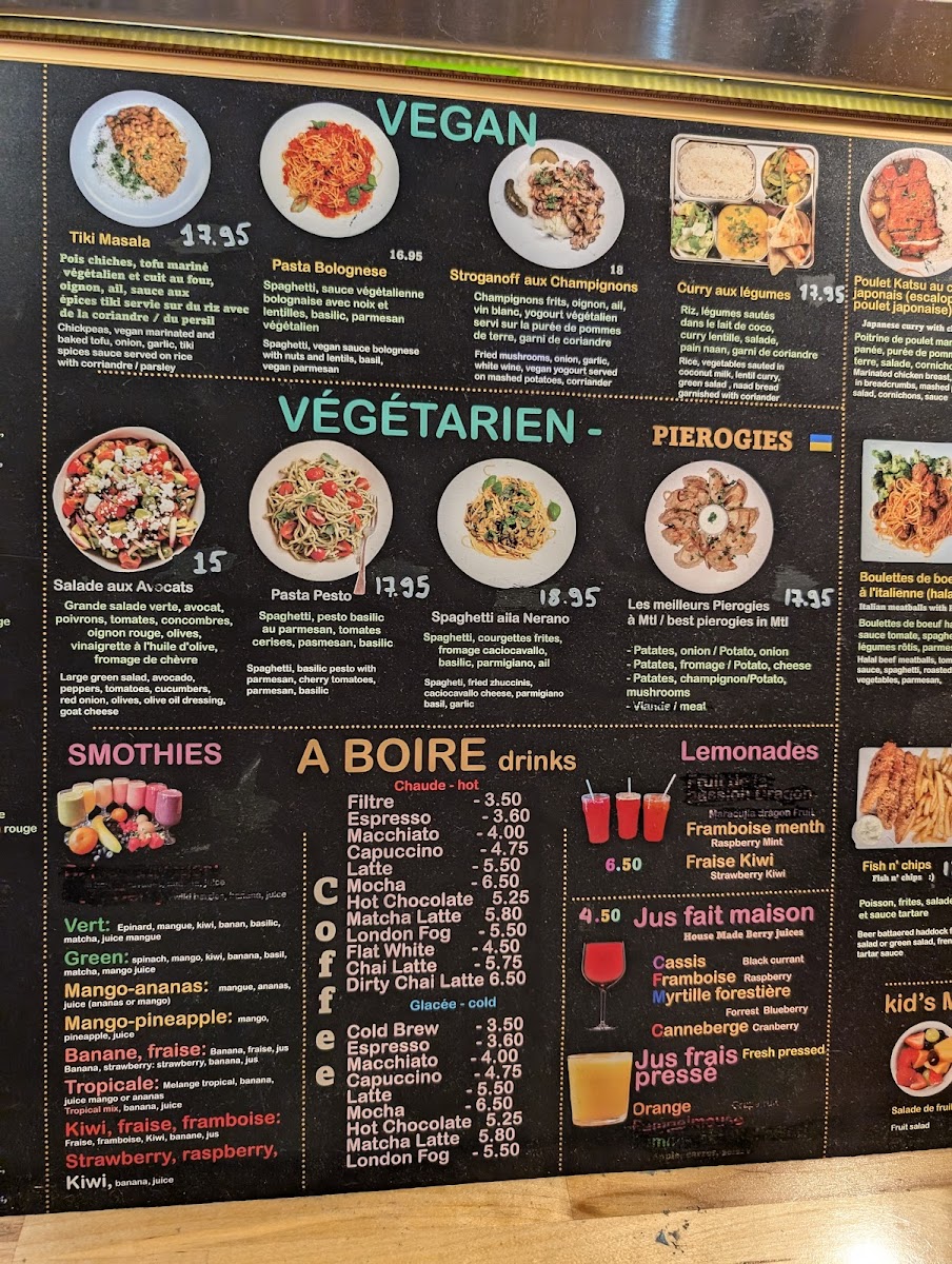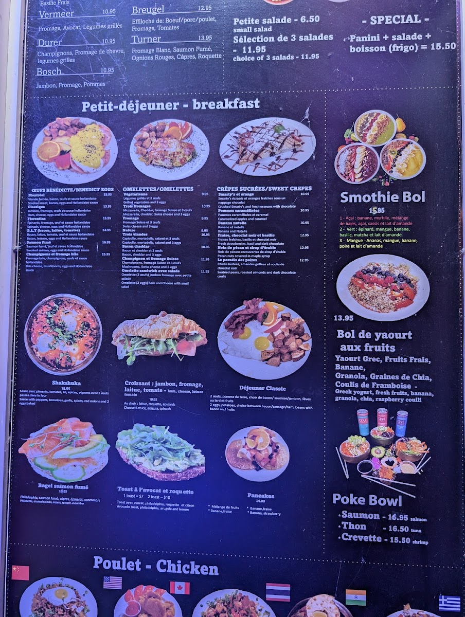 3 oeufs, pesto, tomates cerises, fromage, jambon, oignon, salad verte, Selection de Sélection de viandes du jour ou salmon gravlax 3 eggs, italian pesto, cherry tomatoes, cheese, ham, onion, green salad, toasts, daily selection of meats or salmon gravlax
