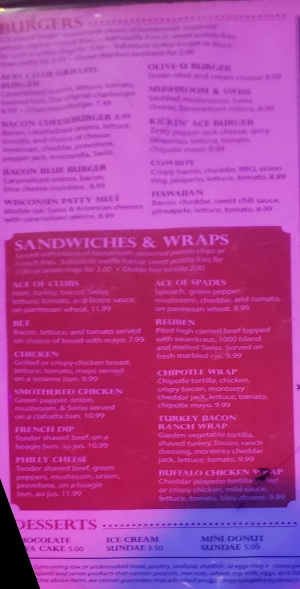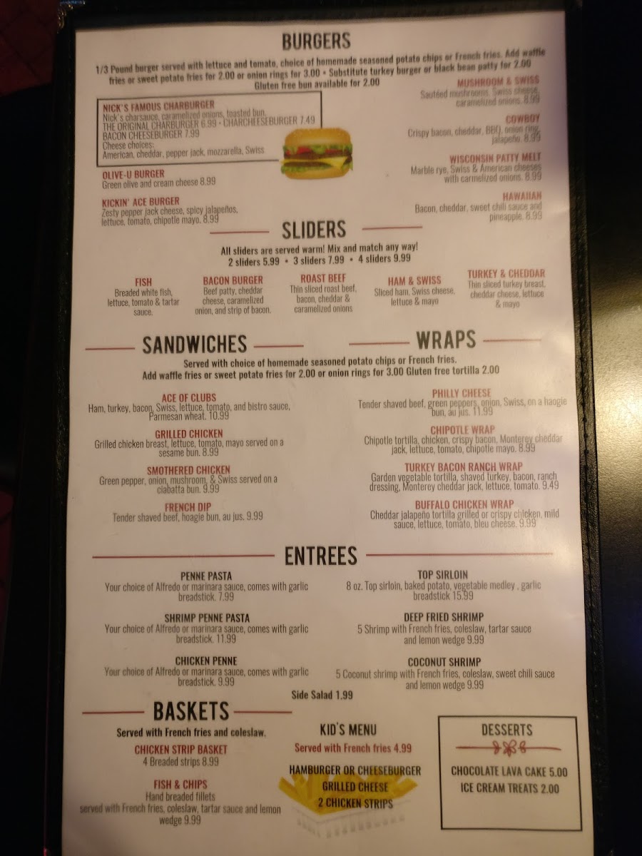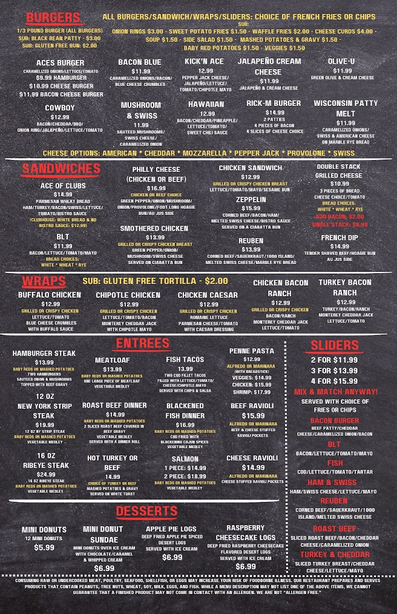 Mix & match anyway! Served with choice of fries or chips. Bacon burger (beef patty, Cheddar cheese, caramelized onion and bacon), BLT (bacon, lettuce, tomato and mayo), fish (cod, lettuce, tomato and tartare), ham & Swiss (ham, Swiss cheese, lettuce and mayo), Reuben (corned beef, sauerkraut, 1000 island and melted Swiss cheese), roast beef (sliced roast beef, bacon, Cheddar cheese and caramelized onion), or turkey & Cheddar (sliced turkey breast, Cheddar cheese, lettuce and mayo).
