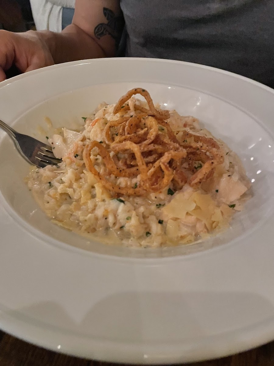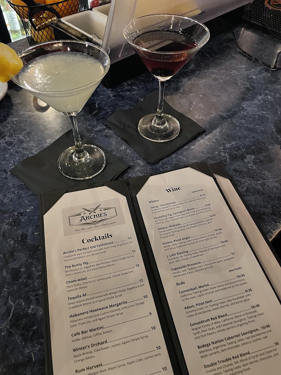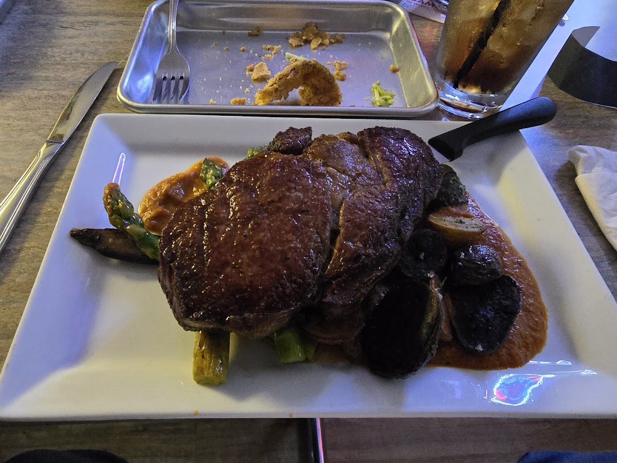 Went for dinner last night with my wife. I had the NewYork strip which was cooked perfectly. The French beans were beautifully blanched and cooked al dente. The steak fries were probably cooked in beef tallow and had amazing flavor, hot and crispy outside and tender inside. By themselves they were great but the parmesan garlic cream sauce on the fries was amazing! A flavor explosion with perfect gravy condistency. The steak had some braised cherries on top which gave a mouthful of steak a nice sweet and tart accent. Delicious. My wife had a lovely green salad with a delightful light vinagrette and some crunchy pepitos. Her meal was the shrimp risotto. The shrimp were huge in size and sweet in flavor with a perfectly done crispy beer batter shell. The risotto was a wild mushroom risotto with rich earthy flavor with some shaved parmesan as a nice salty accompaniment. We shared the rosemary honey creme brulee for desert with a sliced fresh strawberry on top and some toasted crumble on top. The creme was a perfect consistency, the brulee cracked satisfyingly when struck with the spoon and the rosemary came through on the background like a gentle breeze. Amazing meal overall. The Archie's Old Fashioned, made with bourbon and two kinds of bitters and served with a Luxardo cherry is spot on!