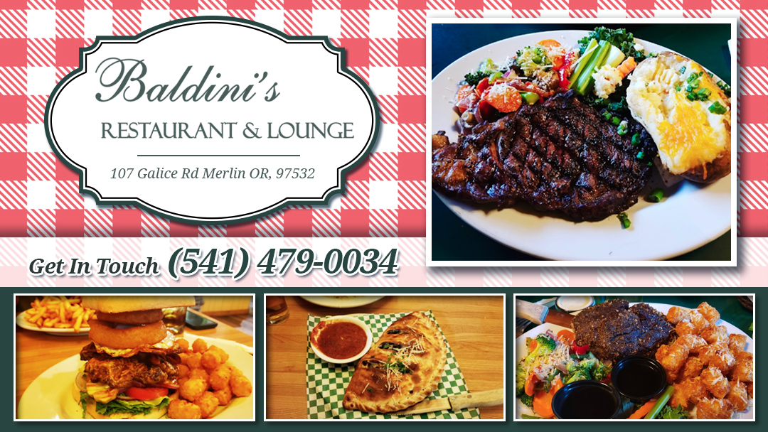 Baldini's Restaurant & Lounge is located at 107 Merlin-Galice Rd, Merlin, OR 97532, United States. This general restaurant type has collected 748 reviews. Peak wait times up to 15 minutes usually occur early evenings or afternoons on Monday (4:00 PM to 6:30 PM), Friday (3:30 PM to 7:00 PM), Saturday (2:30 PM to 8:00 PM), and Sunday (3:00 PM to 7:00 PM). Midweek (Wednesday and Thursday) there's generally no wait. Noteworthy dishes include Bloody Mary, Cowboy Burger, Cocktail, BBQ Ribs, and Margherita Pizza, catering to various tastes with classic and hearty options.