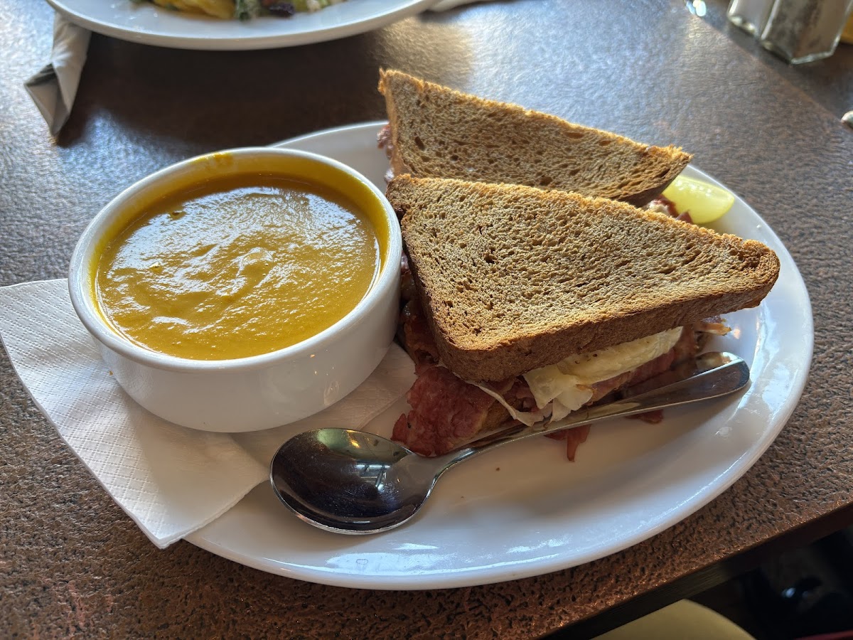 Great spot in downtown Stratford. We stopped in for lunch. I had the soup of the day, which was a parsley cream soup and a half sandwich of the day, chicken bacon sandwich. The soup was delicious but very rich, sat a little heavy. The sandwich was perfect and very filling for a half!! Very fresh and tasty lunch. My friend had the Caesar salad and sandwich, which they enjoyed as well. The server was very attentive and checked in with us several times. Would definitely stop in again!