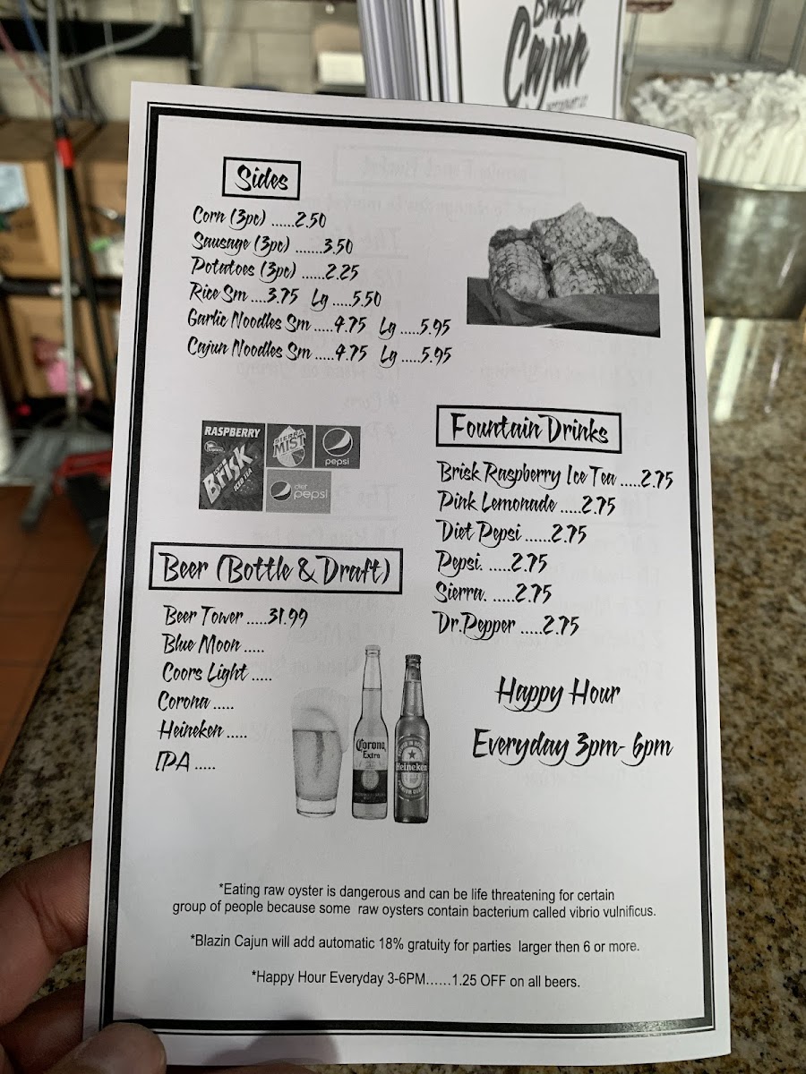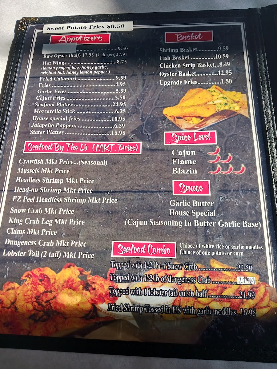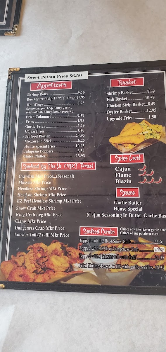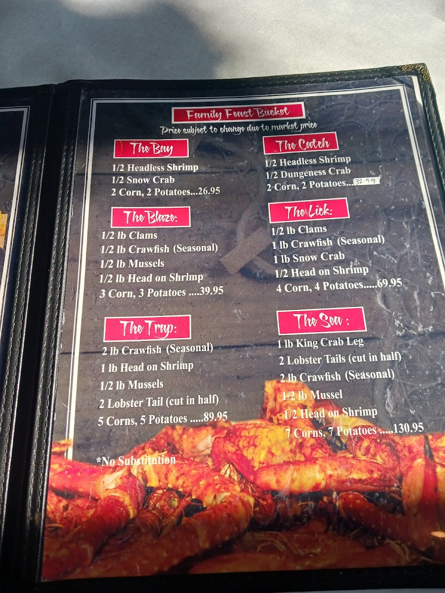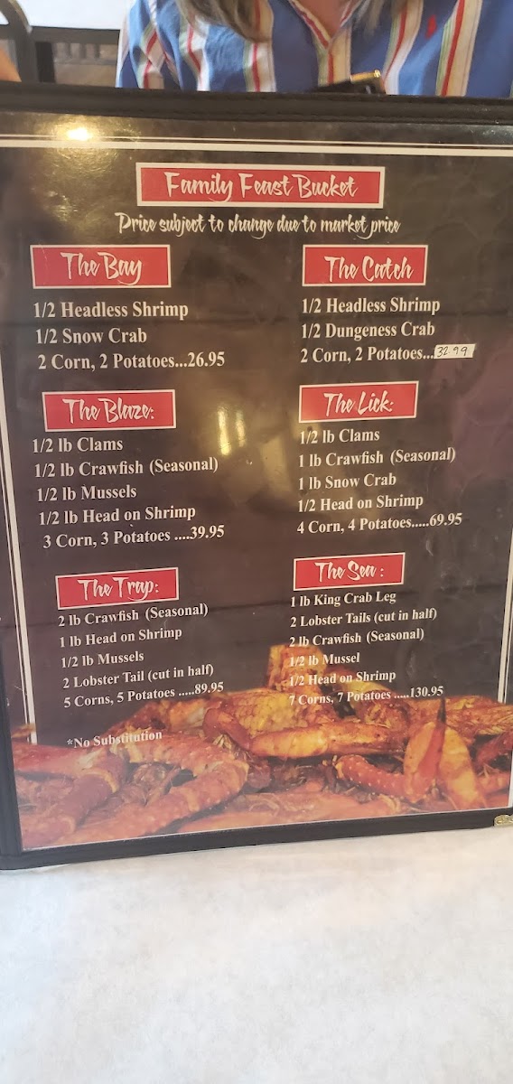 1/2 lb. clams, 1 lb. crawfish, 1 lb. snow crab, 1/2 head on shrimp, 4 corns, 4 potatoes.
