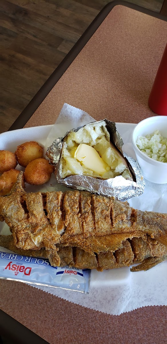 Enjoyed the Fish & Shrimp Plate With Ranch Potato Salad, Beer Battered Onion Rings, Unsweet Tea, & Strawberry Cheesecake for my taste of my experience & it was all good & it's my first time to dine in Bobby's Restaurant in Eva, AL.