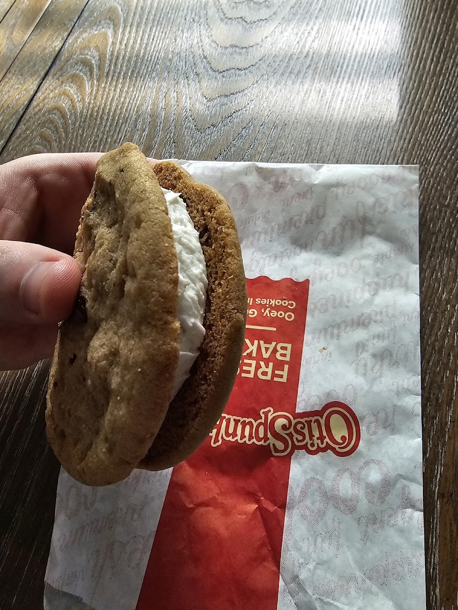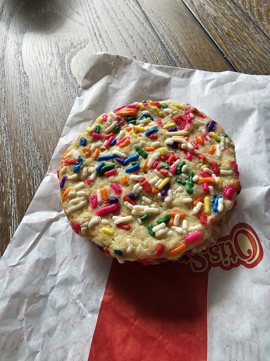 I appreciate that they have vegetarian options. The food I got was good, and the prices are inexpensive. I got the VegiMax sandwich. It was fine but nothing to write home about, and the bread was disintegrating when they served it to me which meant the sandwich as a whole didn't hold together. The cookies were very good though. I got the sugar cookie and sprinkle cookie. The individual cookies were $0.95 each. The Monster Cookie has buttercream sandwiched between two cookies. The cashier told me I could customize my own Monster Cookie with different individual cookies, too. There is seating inside and outdoors on a covered porch, and there are a few parking spots, too.