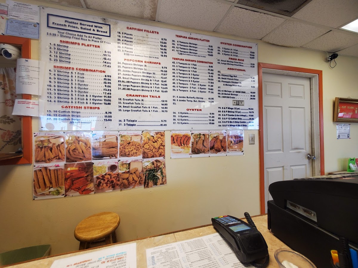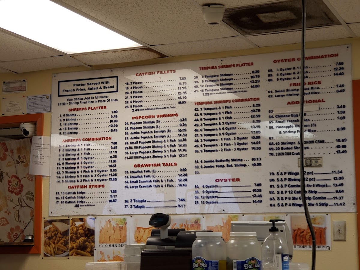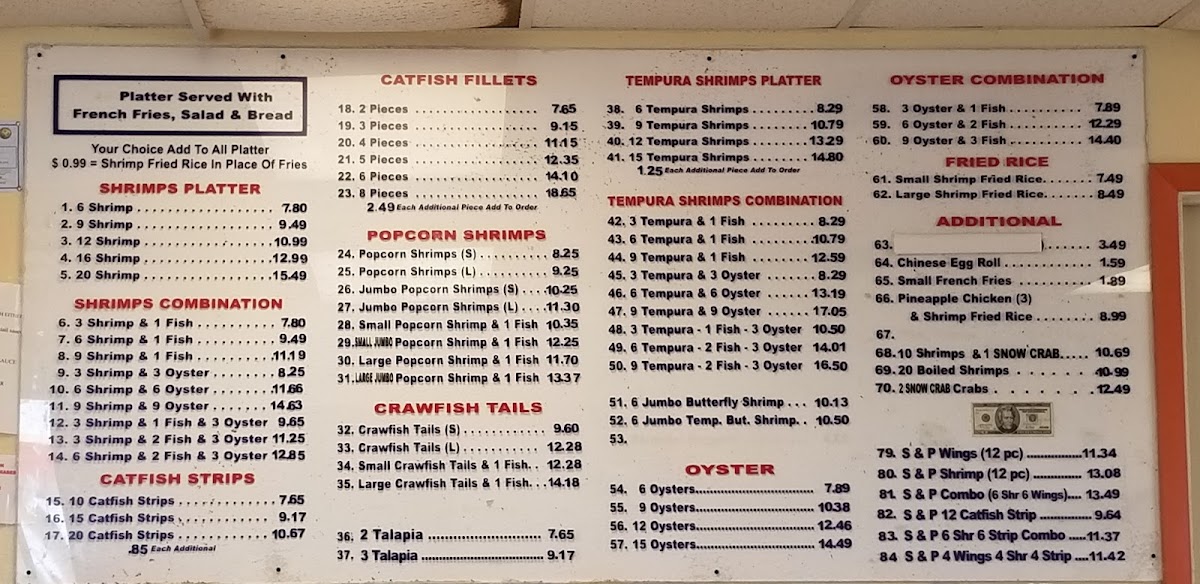 1 fried catfish, 2 fried shrimps, 2 tempura shrimps, 2 fried oysters, and 1 egg roll.
