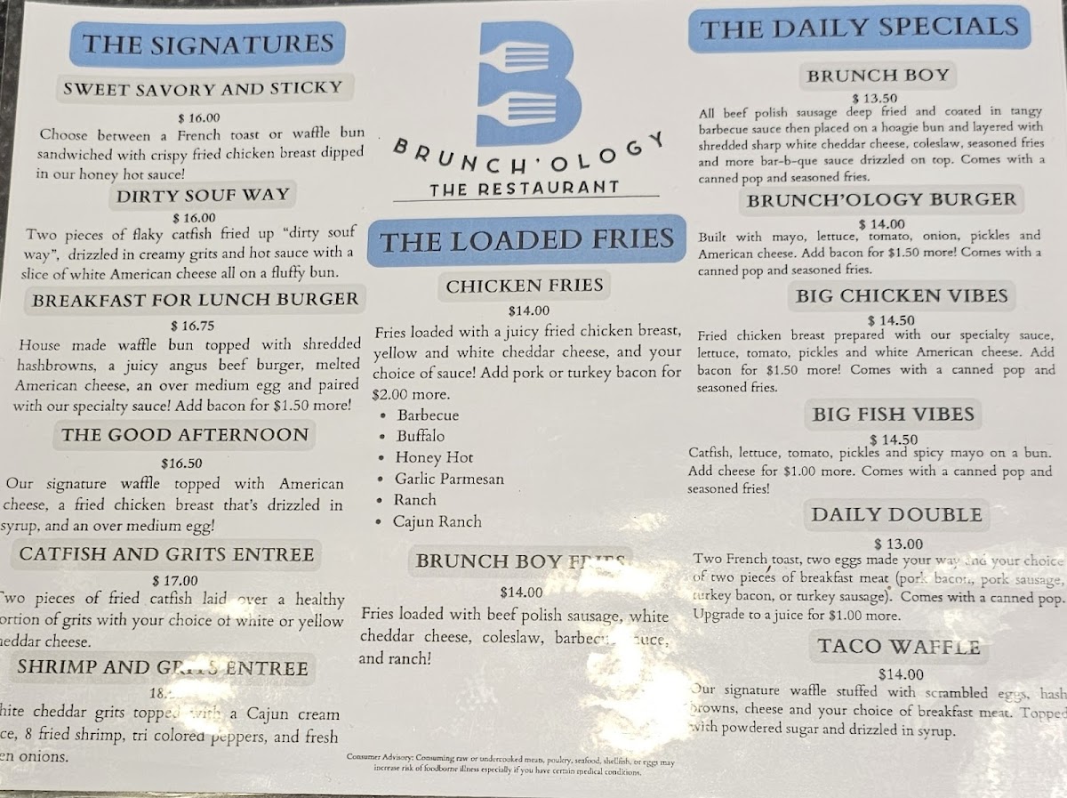 All beef polish sausage deep fried then dipped in BRUNCH OLOGY barbecue sauce, on a hoagie bun with shredded white cheddar cheese, and coleslaw. Comes with a canned pop and seasoned fries.