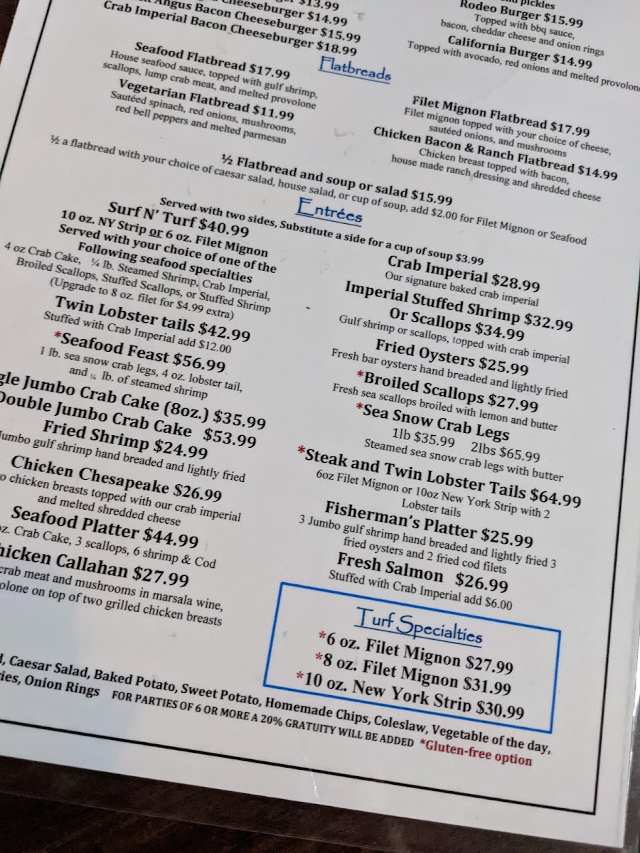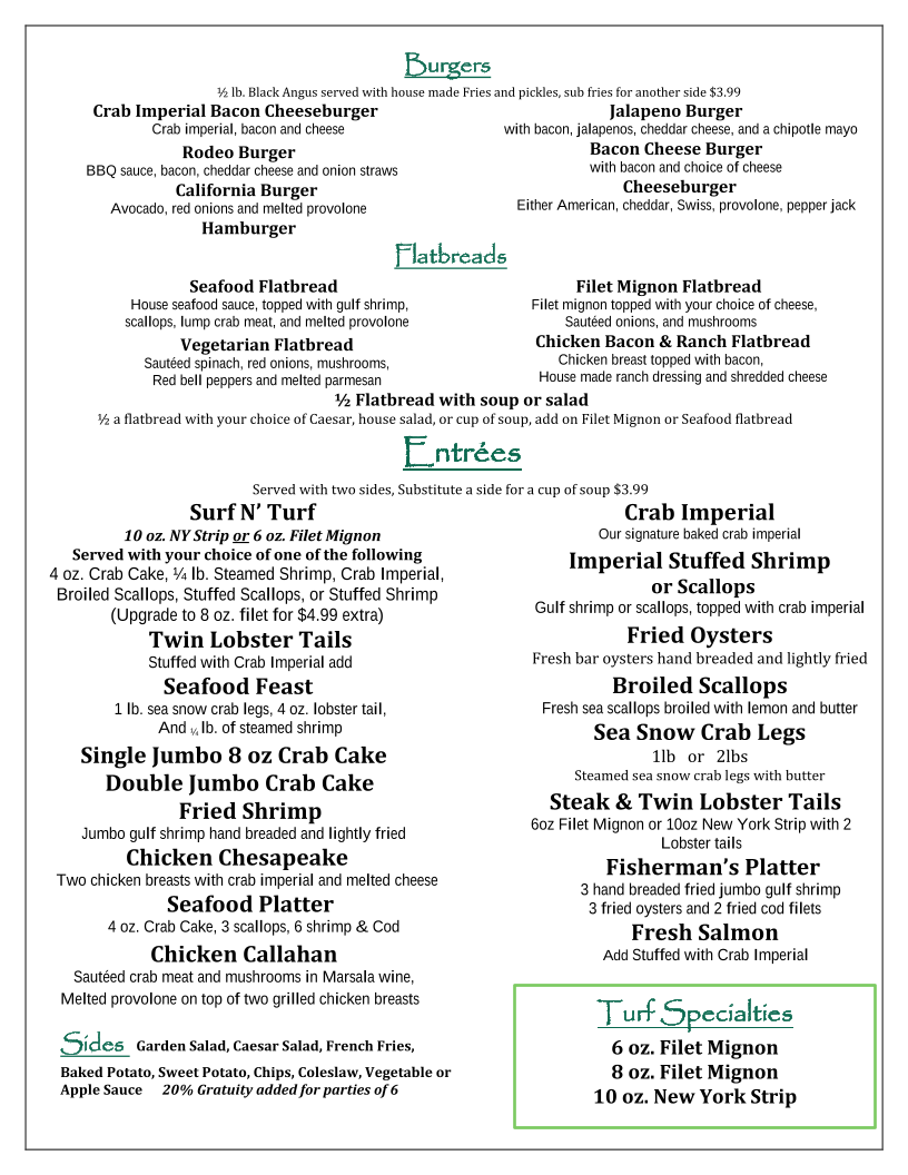 10 oz. NY Strip or 6 oz. Filet Mignon Served with your choice of one of the following: 4 oz. Crab Cake, ¼ lb. Steamed Shrimp, Crab Imperial, Broiled Scallops, Stuffed Scallops, or Stuffed Shrimp (Upgrade to 8 oz. filet for $4.99 extra)